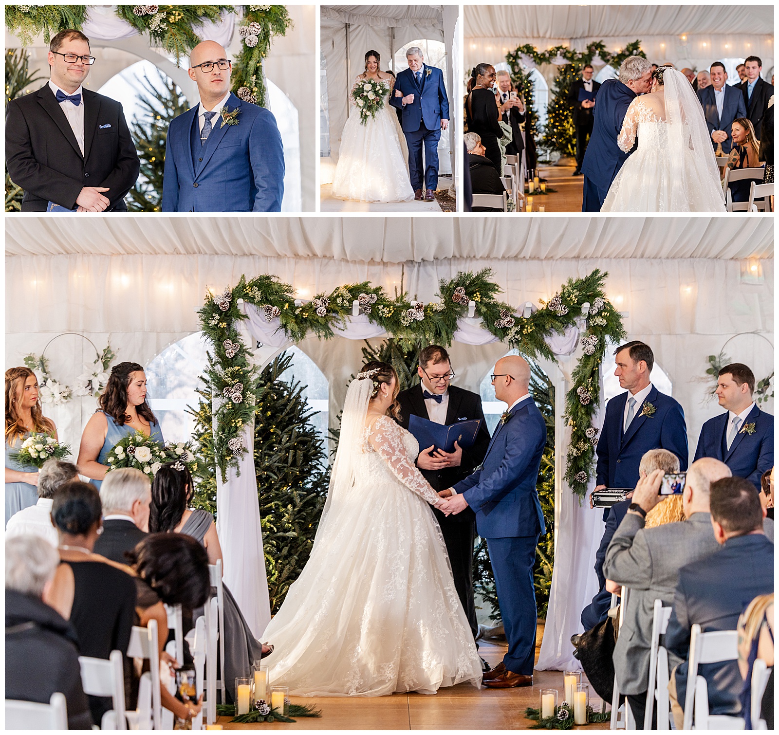 Greenery draped the arbor, pinecones and candles lined the aisle, and soft twinkle lights created the kind of glow that makes everything feel intimate and sacred.