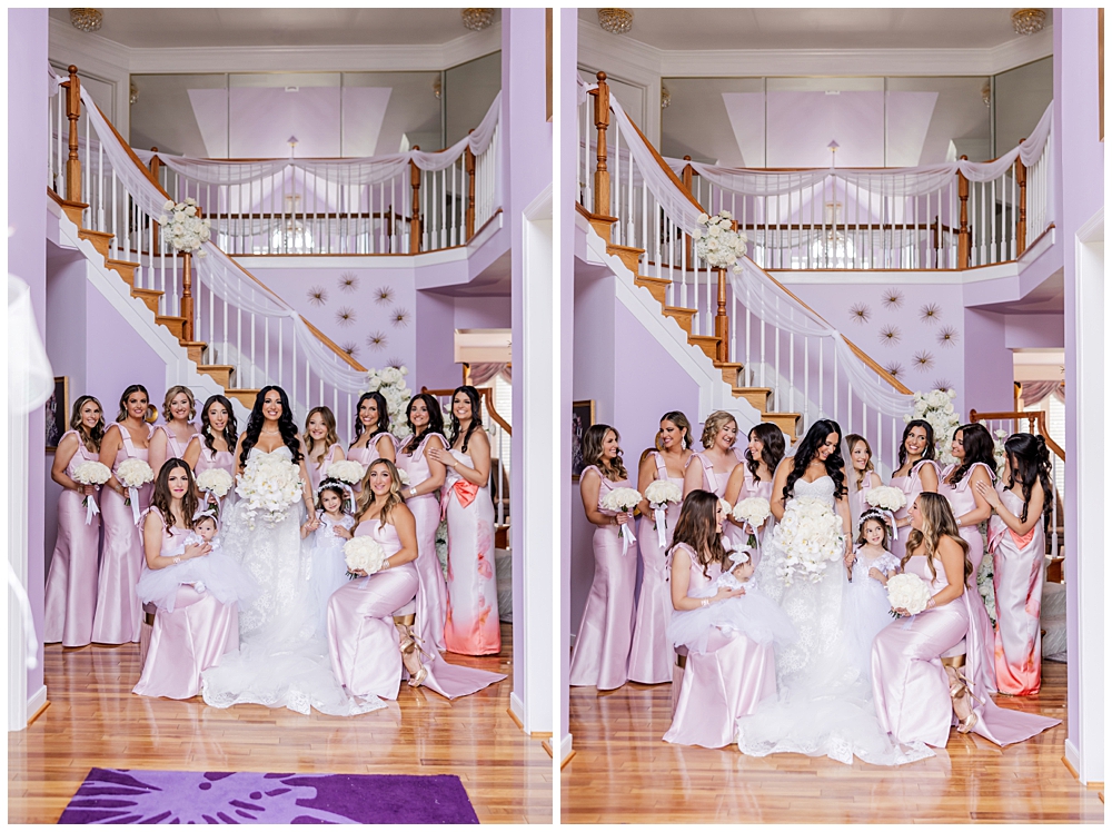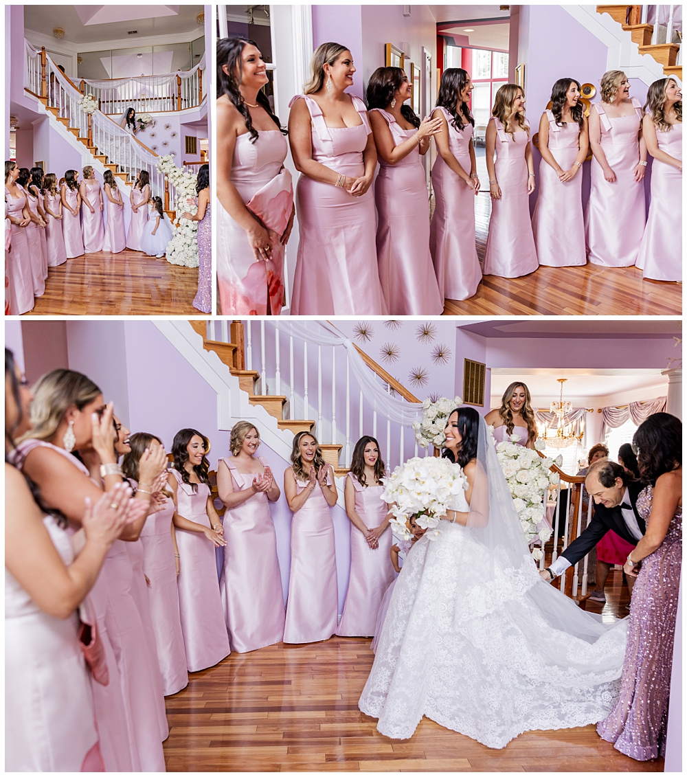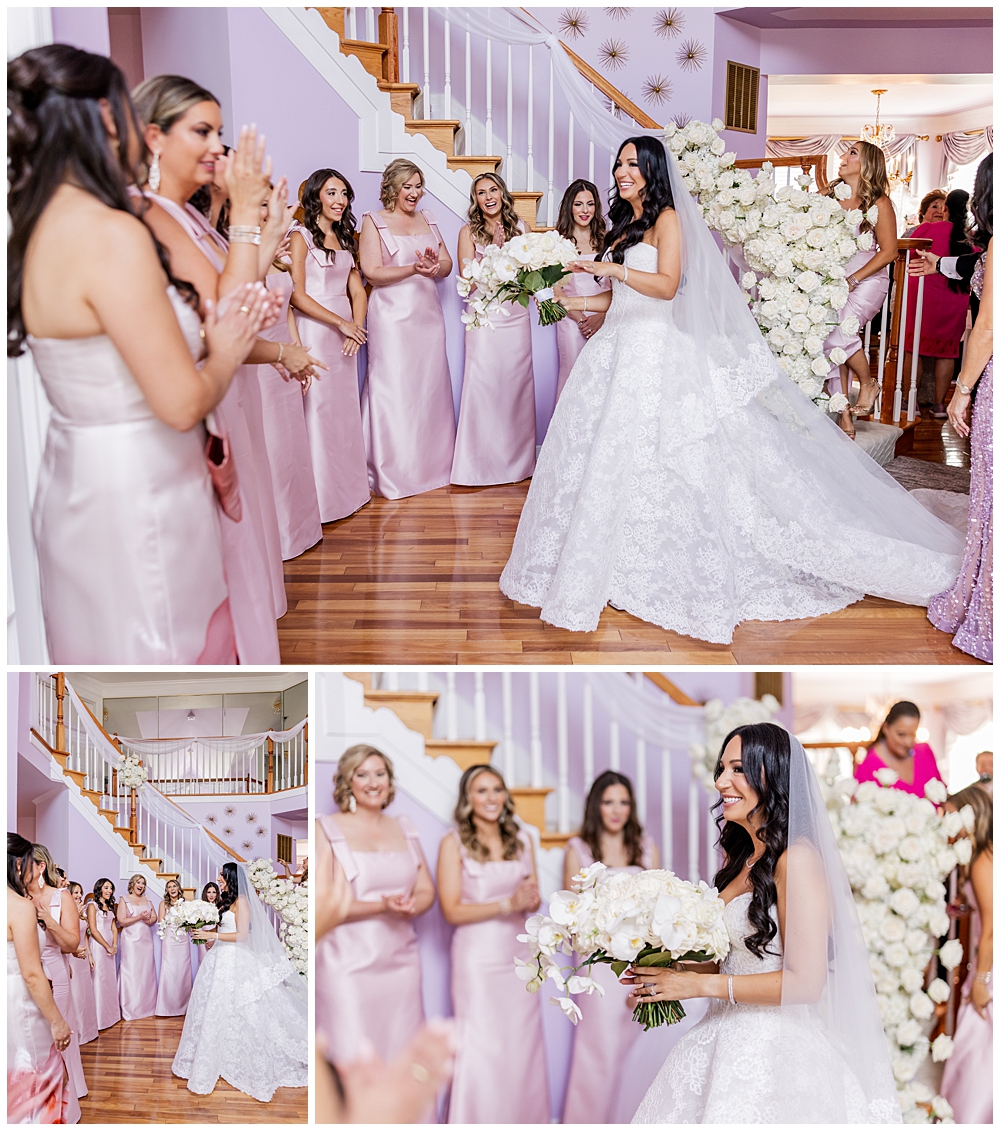 Eirini looked absolutely stunning in her gown — layers of lace, a sweeping train, and a bouquet that could have been straight out of a royal wedding. Her bridesmaids, glowing in blush satin, surrounded her with so much love and excitement as she made her grand staircase reveal. It was the perfect way to start a day that would overflow with emotion, tradition, and celebration.