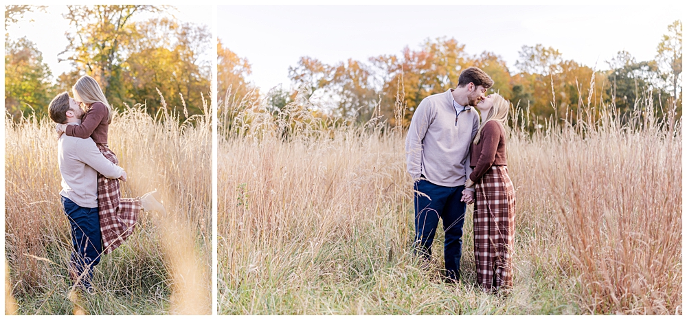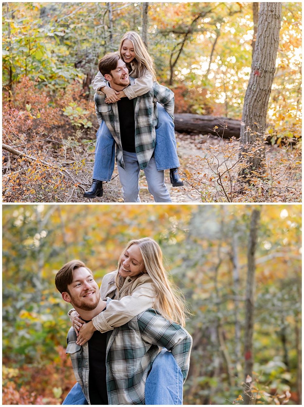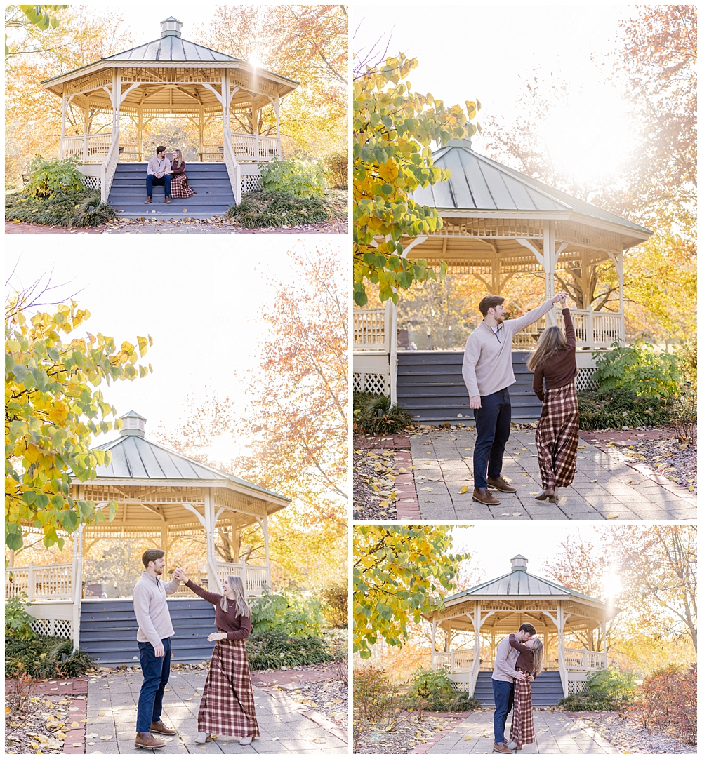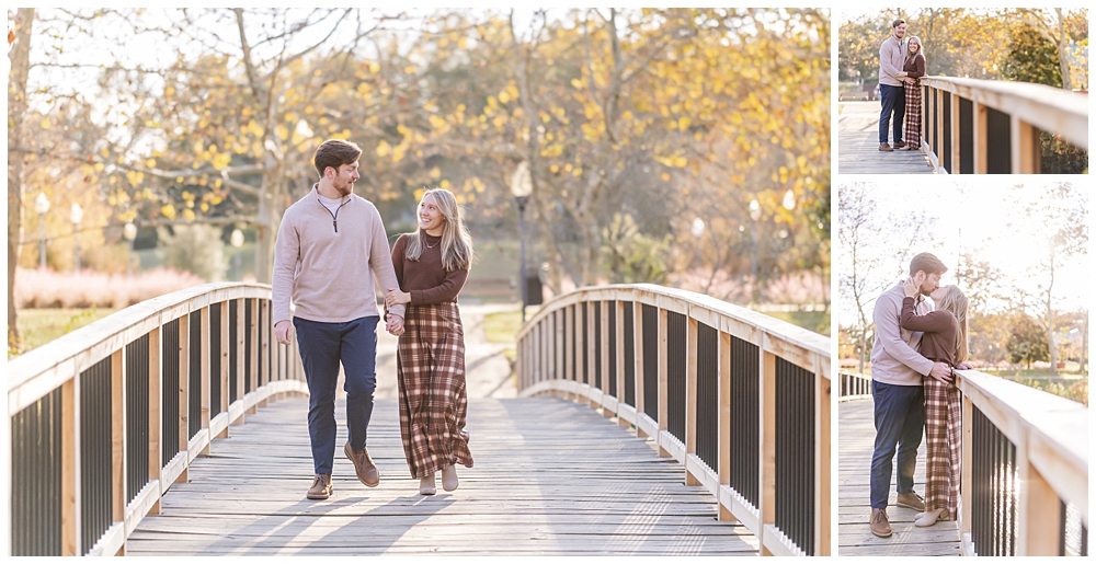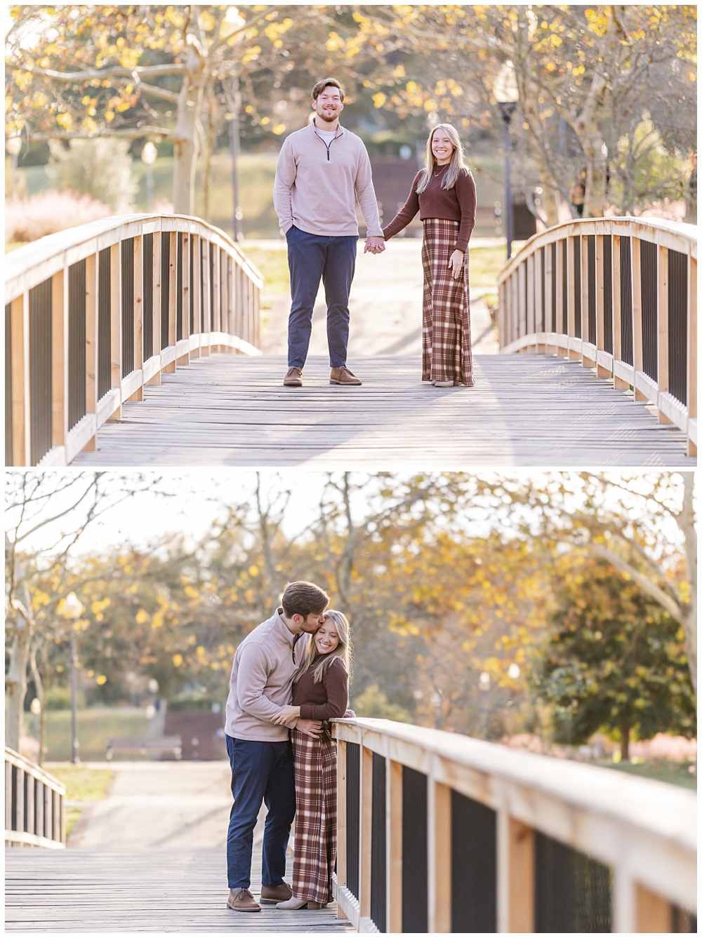 We wandered the brick paths beneath glowing trees, paused along the footbridge as the light filtered through the leaves, and tucked into quieter corners of the park where the world felt slower. Maddi’s warm tones and plaid paired beautifully with the autumn palette, and Mike’s laid-back style matched the mood perfectly—timeless, natural, and comfortable.
