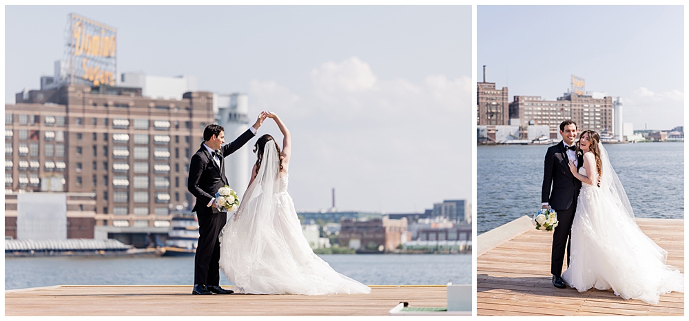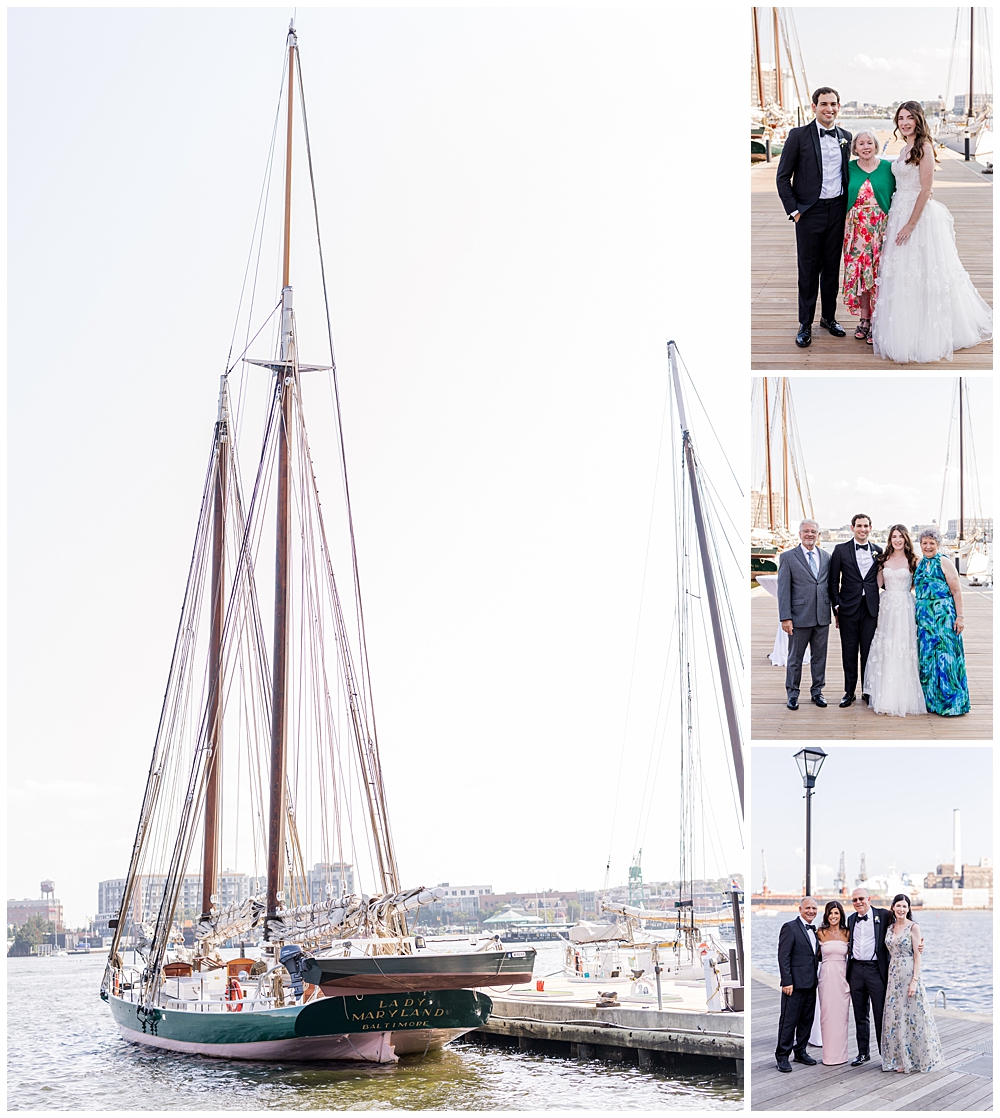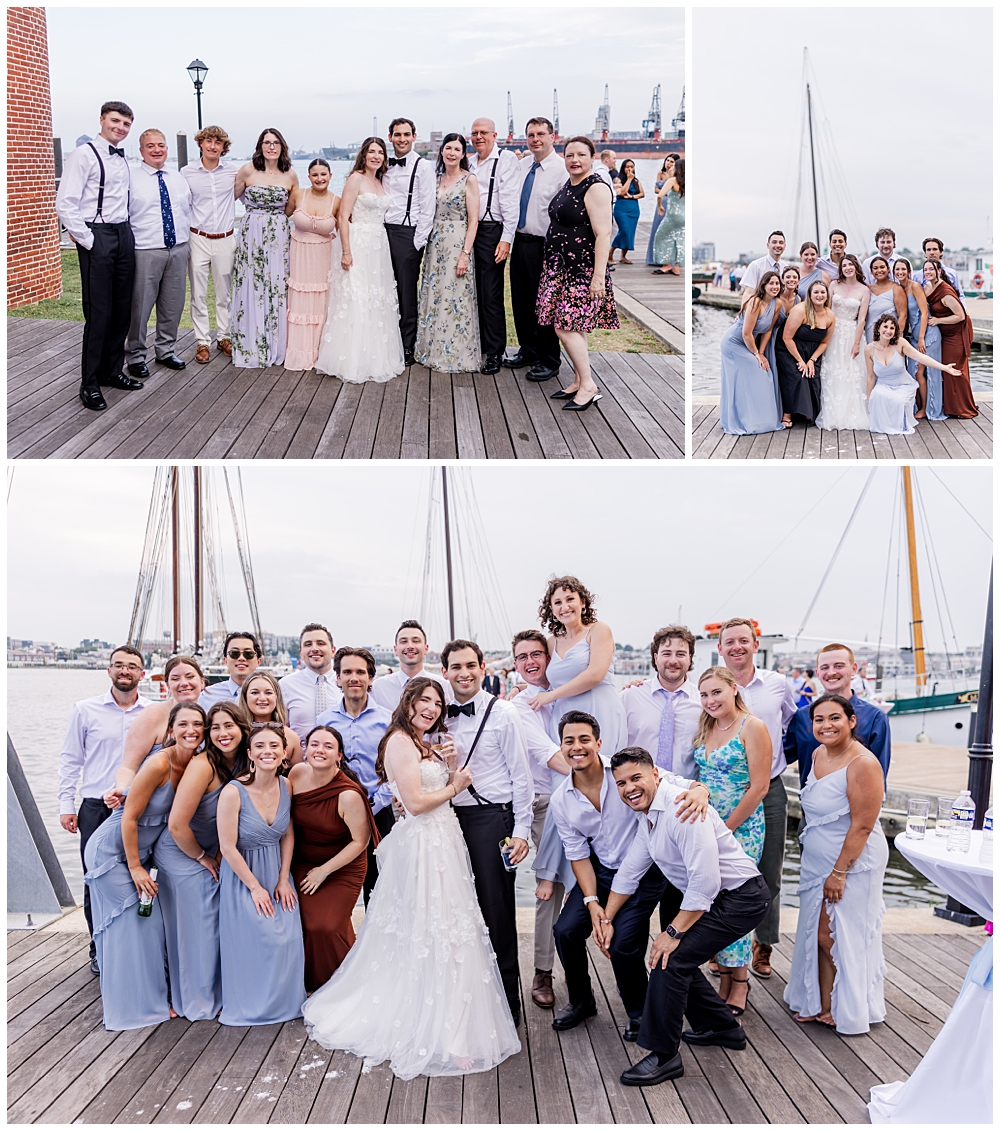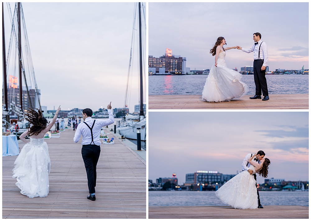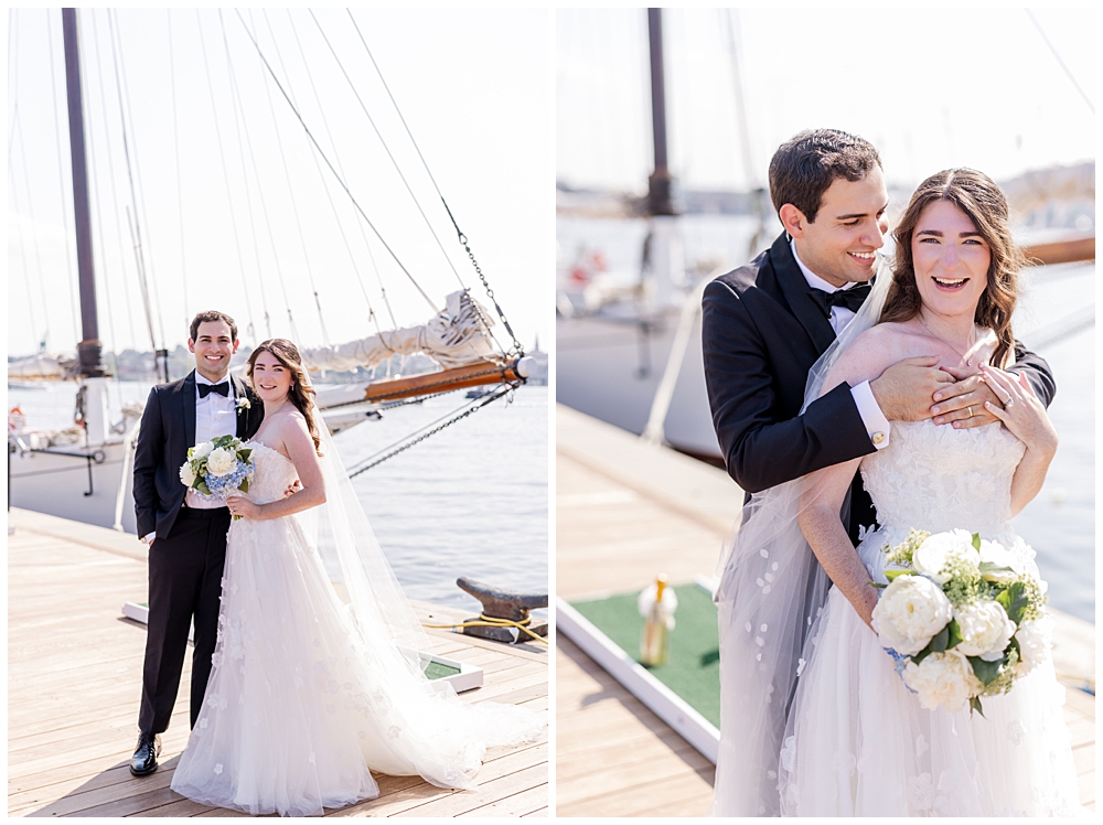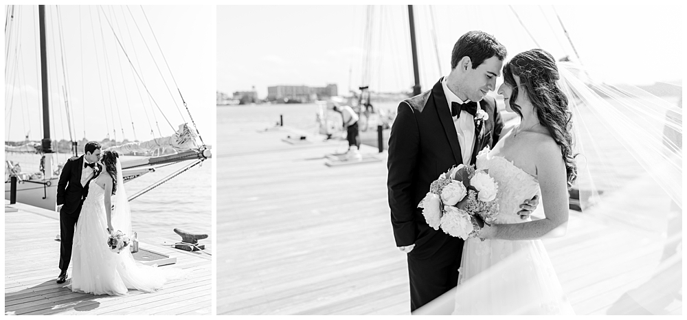 After the ceremony, we explored the Loyola grounds for portraits with the wedding party, taking advantage of the beautiful stone buildings and tree-lined walkways. Later, we headed to the venue on the Inner Harbor for couple portraits—sunlight reflecting off the water, sails in the background, and the Baltimore skyline creating the dreamiest canvas. Mariana’s veil floated in the breeze while Justin couldn’t stop smiling at his bride—those little in-between moments were magic. And then it eventually blew into the harbor resulting in some shrugged shoulders and laughter.