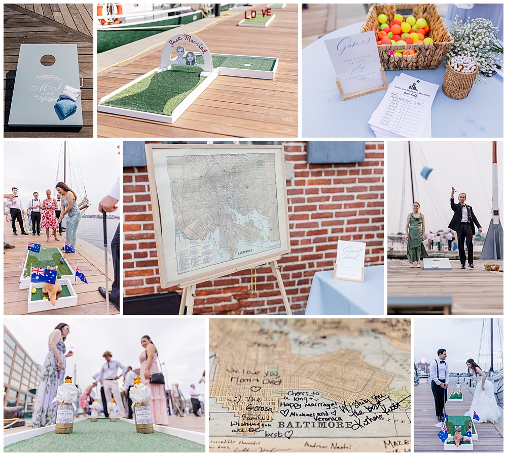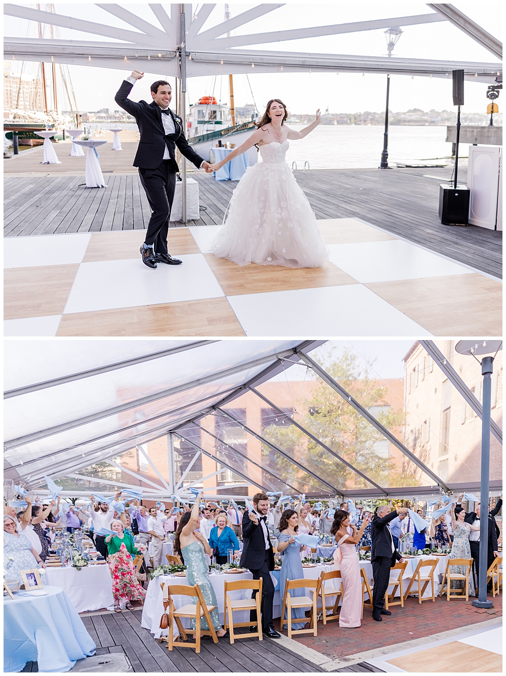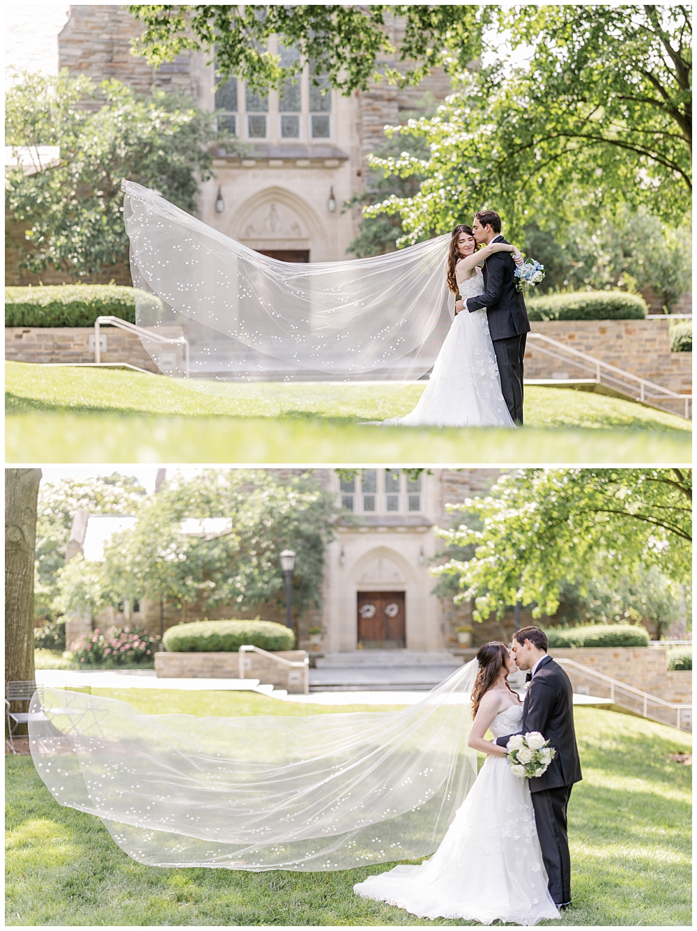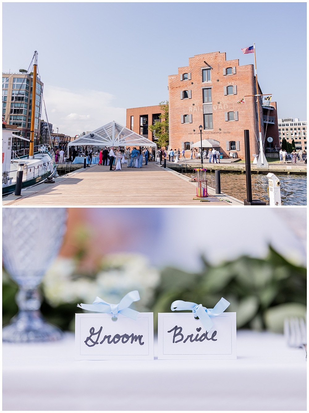 After the ceremony, we explored the Loyola grounds for portraits with the wedding party, taking advantage of the beautiful stone buildings and tree-lined walkways. Later, we headed to the venue on the Inner Harbor for couple portraits—sunlight reflecting off the water, sails in the background, and the Baltimore skyline creating the dreamiest canvas. Mariana’s veil floated in the breeze while Justin couldn’t stop smiling at his bride—those little in-between moments were magic. And then it eventually blew into the harbor resulting in some shrugged shoulders and laughter.