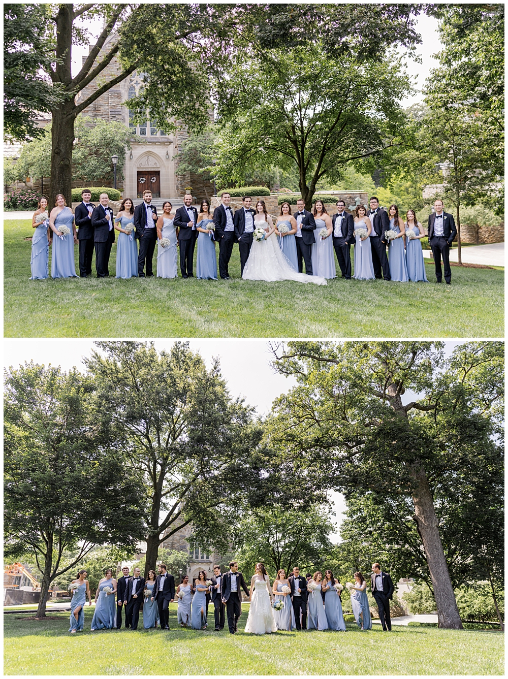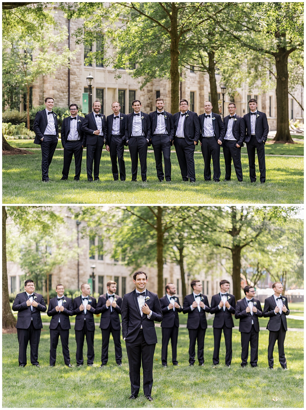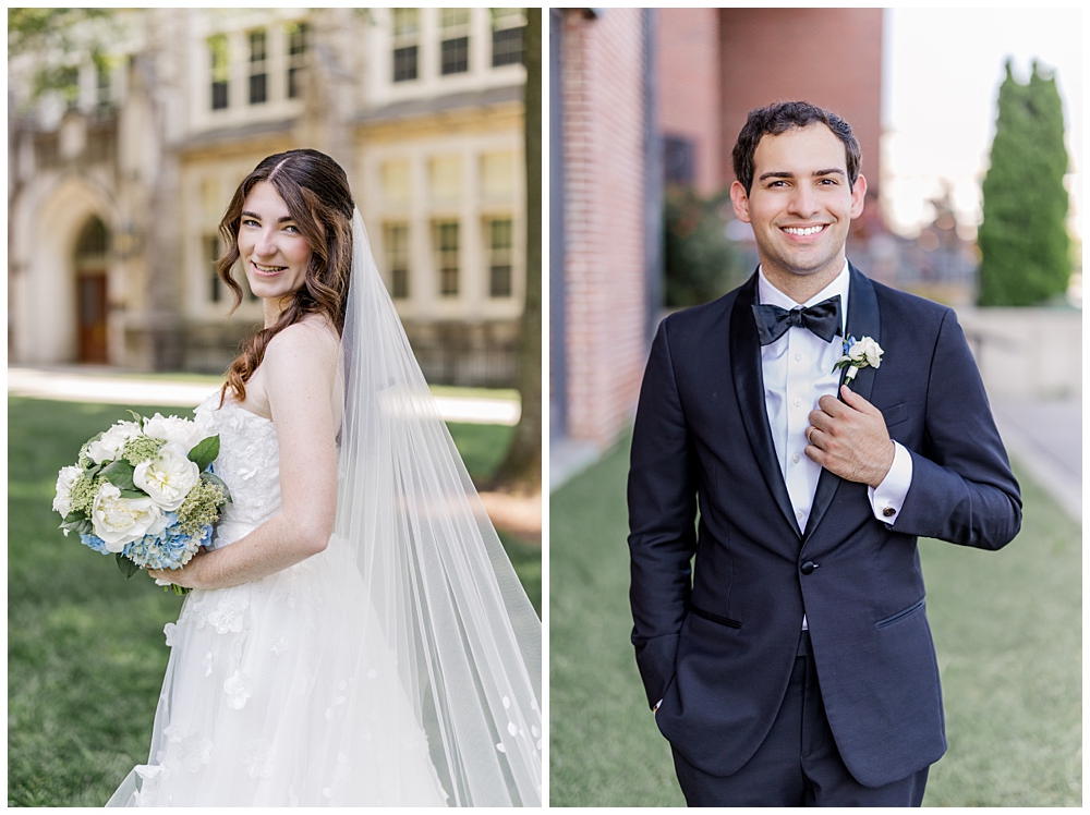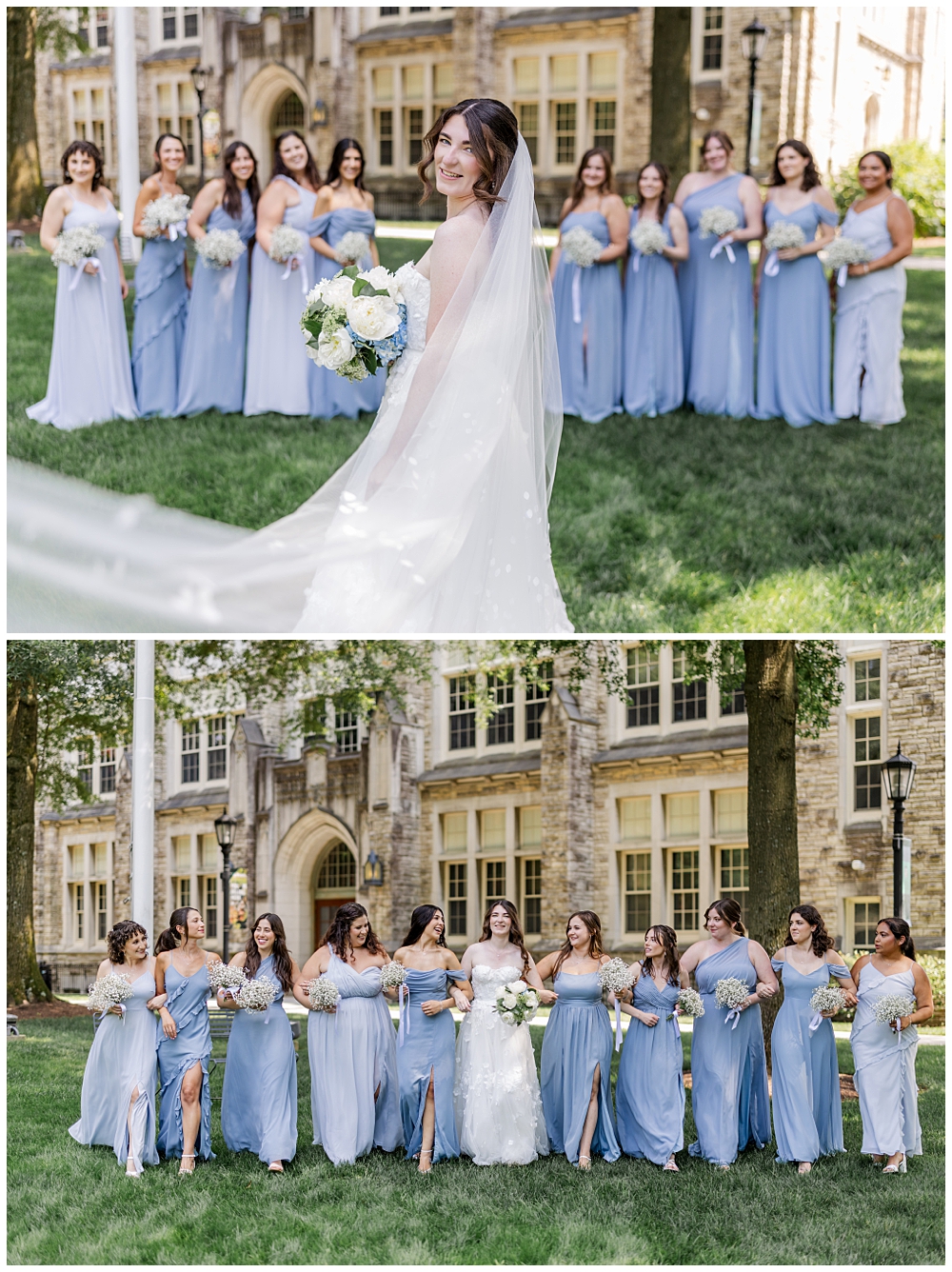 After the ceremony, we explored the Loyola grounds for portraits with the wedding party, taking advantage of the beautiful stone buildings and tree-lined walkways. Later, we headed to the venue on the Inner Harbor for couple portraits—sunlight reflecting off the water, sails in the background, and the Baltimore skyline creating the dreamiest canvas. Mariana’s veil floated in the breeze while Justin couldn’t stop smiling at his bride—those little in-between moments were magic. And then it eventually blew into the harbor resulting in some shrugged shoulders and laughter.
