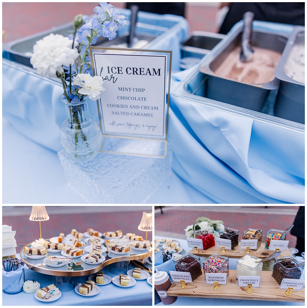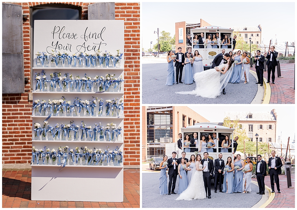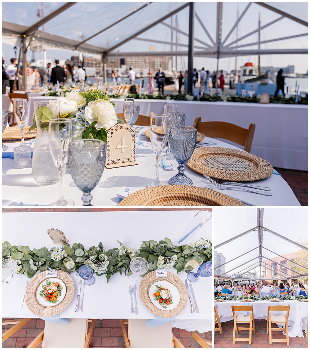 The celebration continued at the Frederick Douglass Museum, one of Baltimore’s most unique and stunning waterfront venues. Guests were greeted with breathtaking harbor views and a modern, open reception space filled with natural light. The details were perfectly curated—soft blue accents, lush florals of whites and blues, and an atmosphere that felt both romantic and fun.