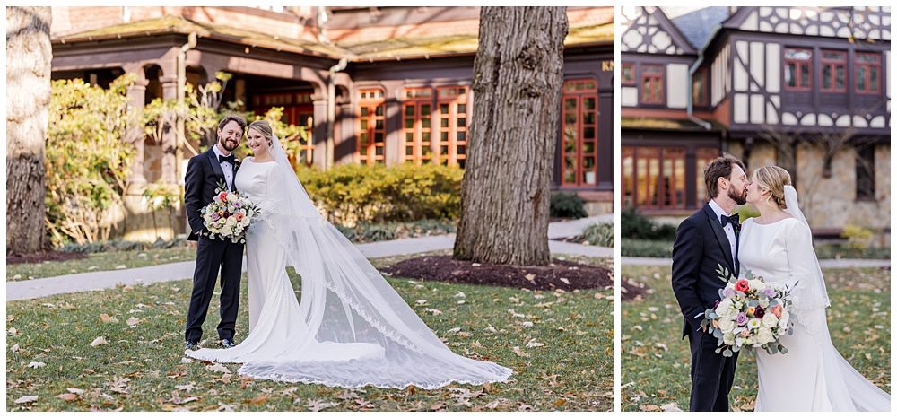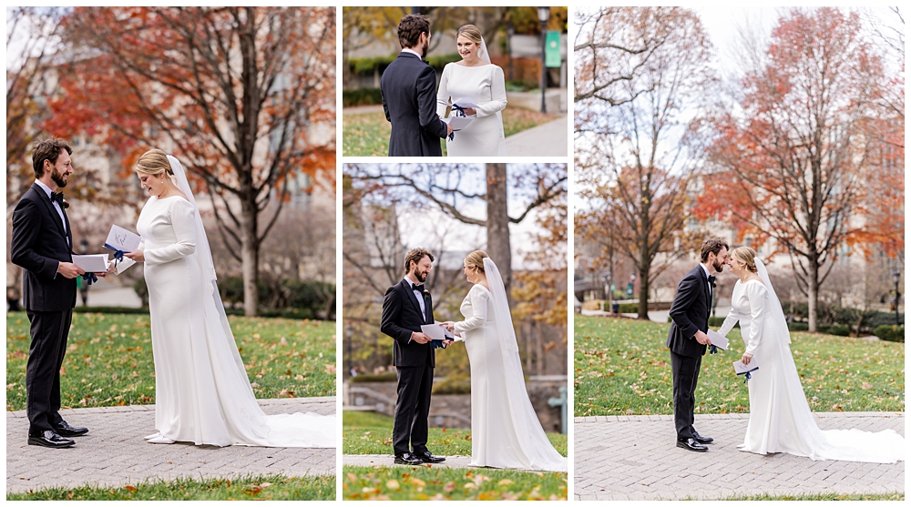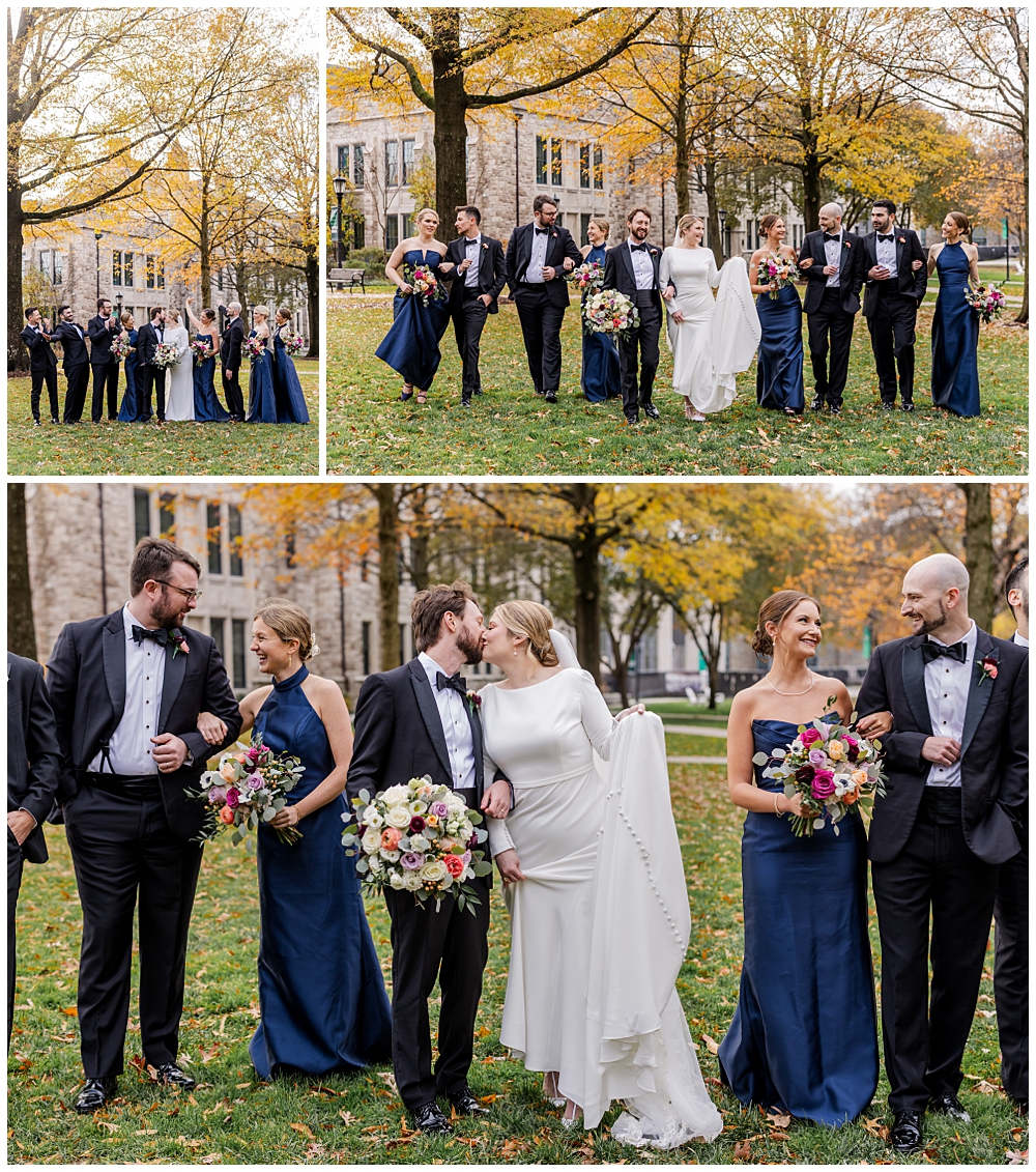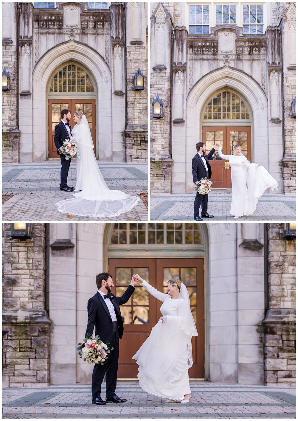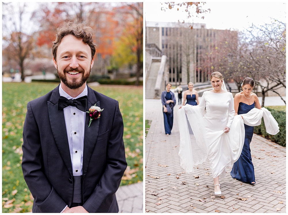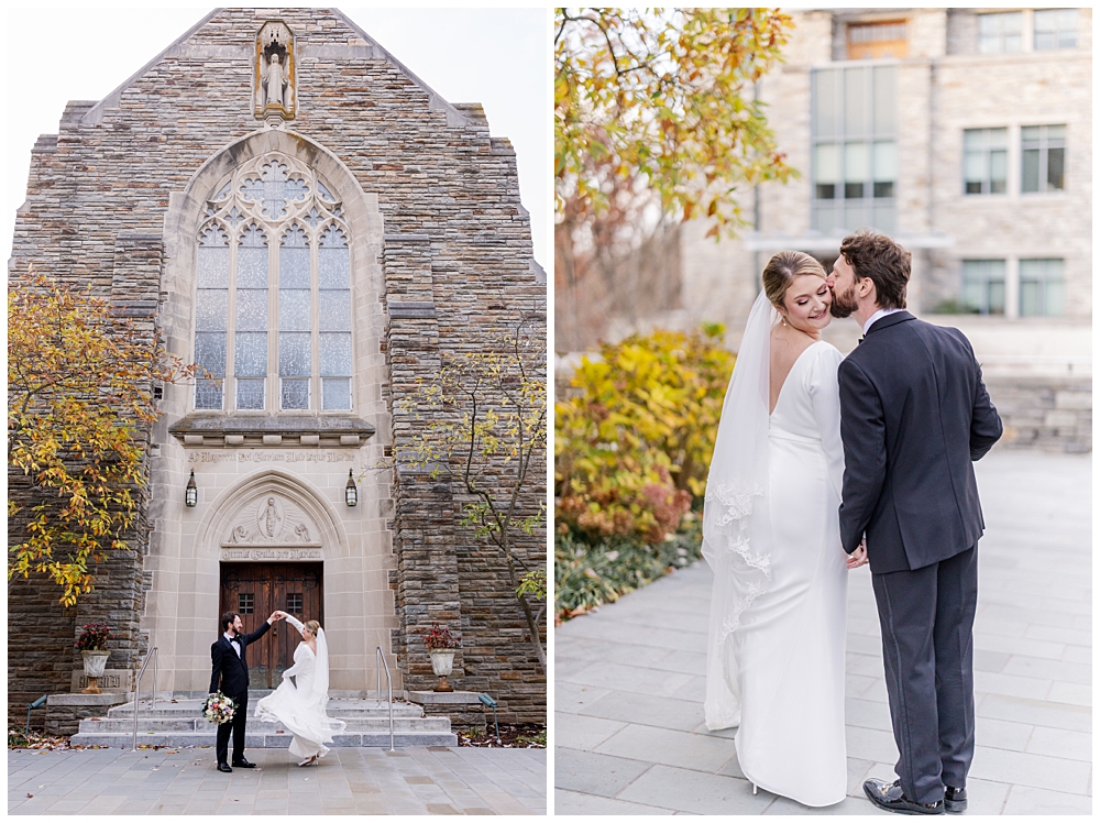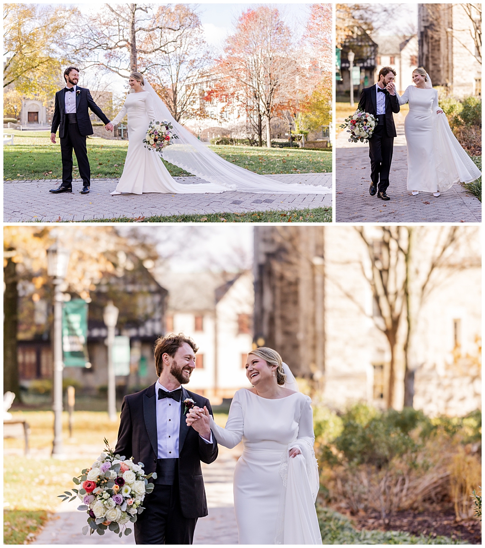 Prior to the ceremony, we explored the grounds for portraits that captured the crisp fall air and the understated beauty of the season. A first look on the lawns outside the chapel, portraits near their favorite hangout spots on campus, soft golden leaves, stone architecture, and quiet pathways created the perfect backdrop for portraits that felt natural, romantic, and unforced.