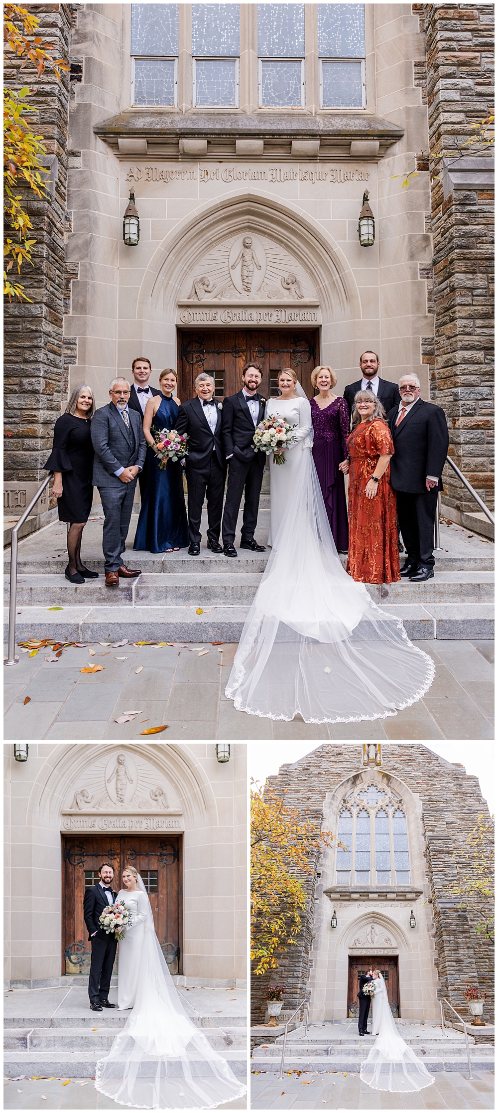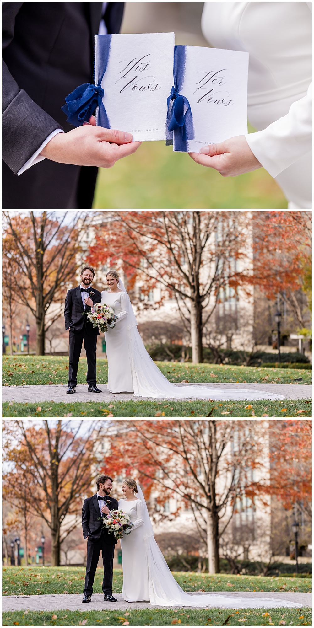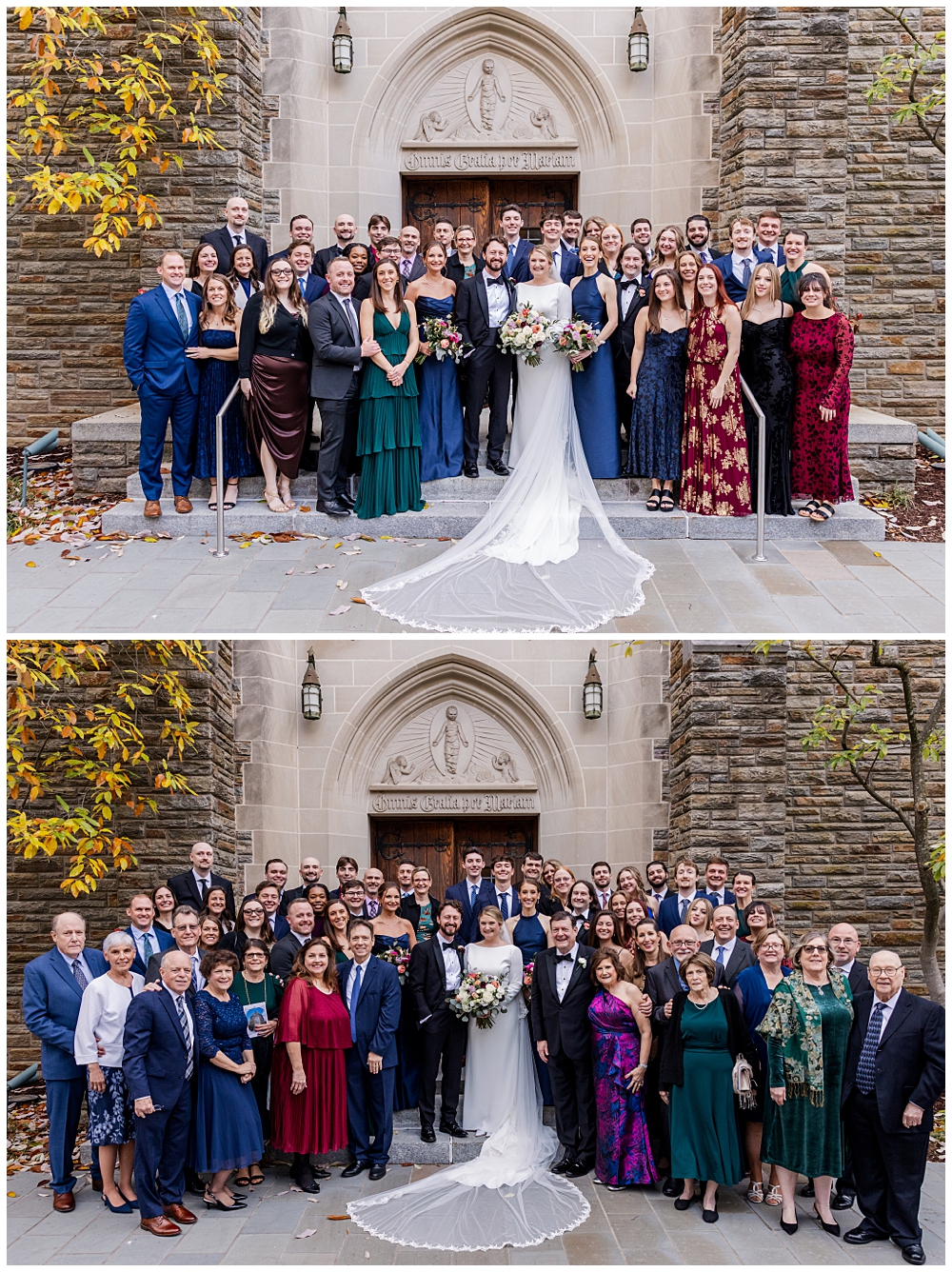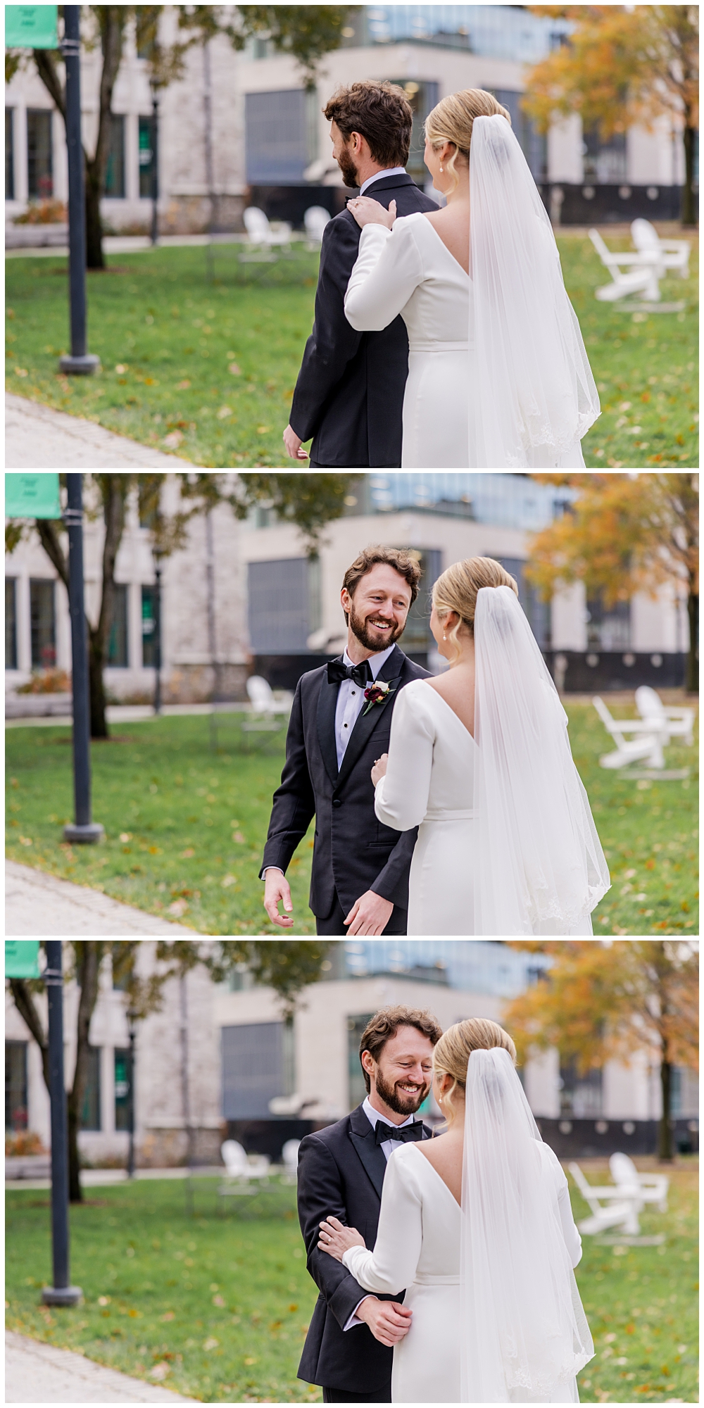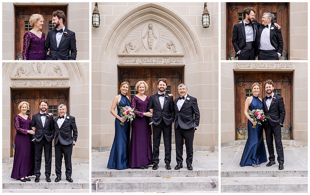 Prior to the ceremony, we explored the grounds for portraits that captured the crisp fall air and the understated beauty of the season. A first look on the lawns outside the chapel, portraits near their favorite hangout spots on campus, soft golden leaves, stone architecture, and quiet pathways created the perfect backdrop for portraits that felt natural, romantic, and unforced.