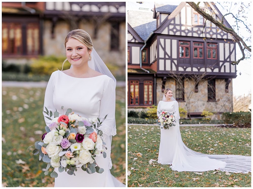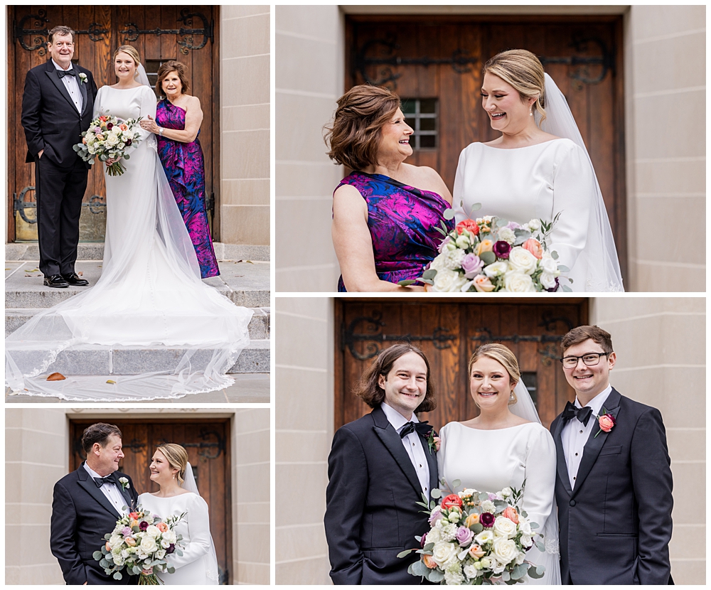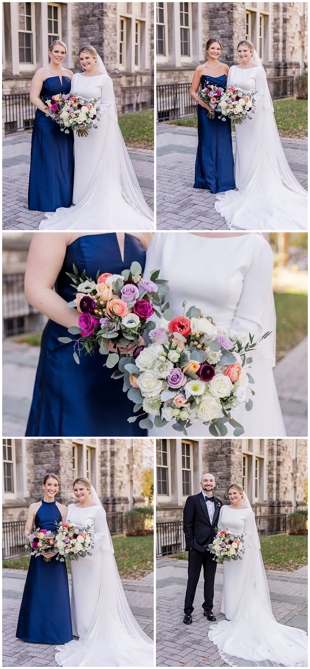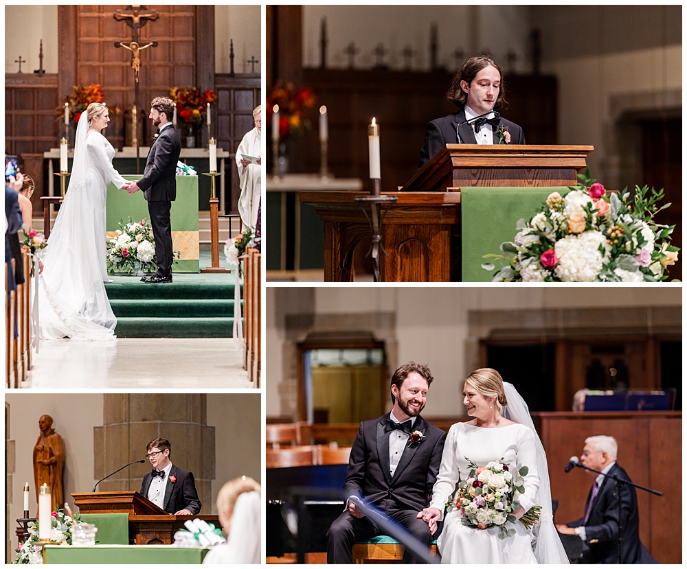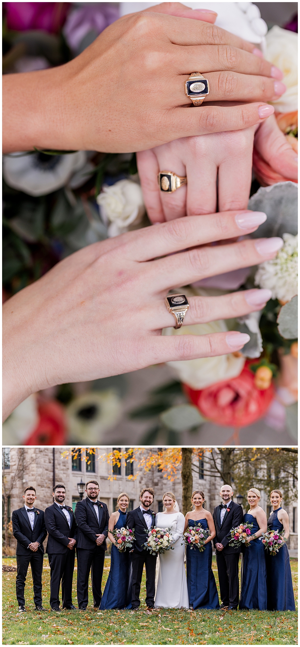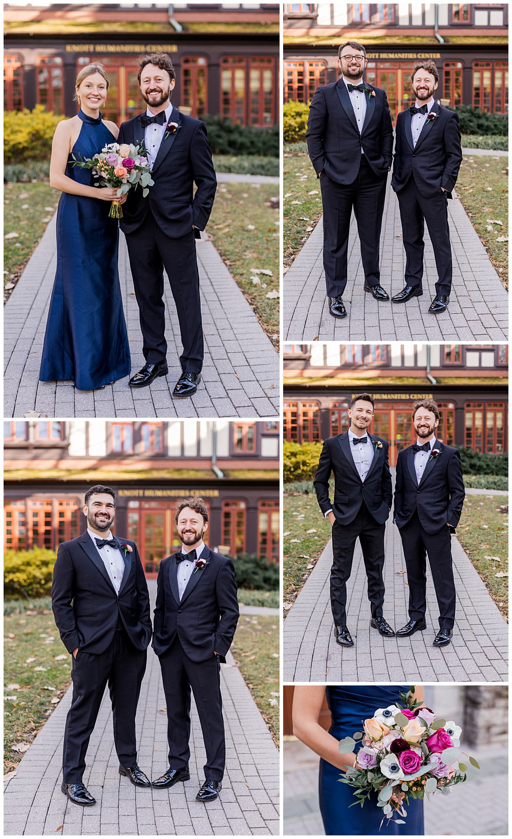 Prior to the ceremony, we explored the grounds for portraits that captured the crisp fall air and the understated beauty of the season. A first look on the lawns outside the chapel, portraits near their favorite hangout spots on campus, soft golden leaves, stone architecture, and quiet pathways created the perfect backdrop for portraits that felt natural, romantic, and unforced.
