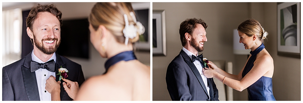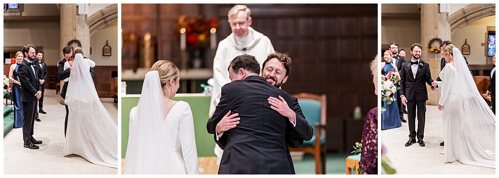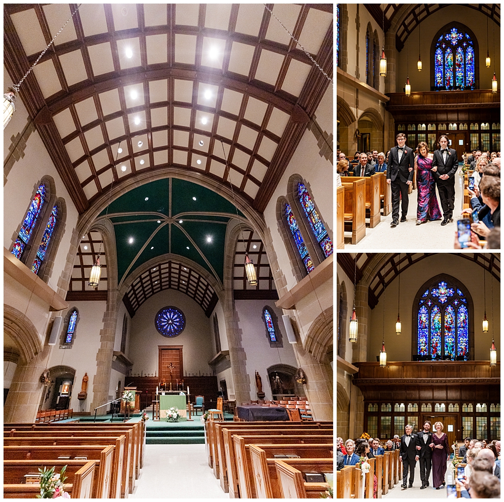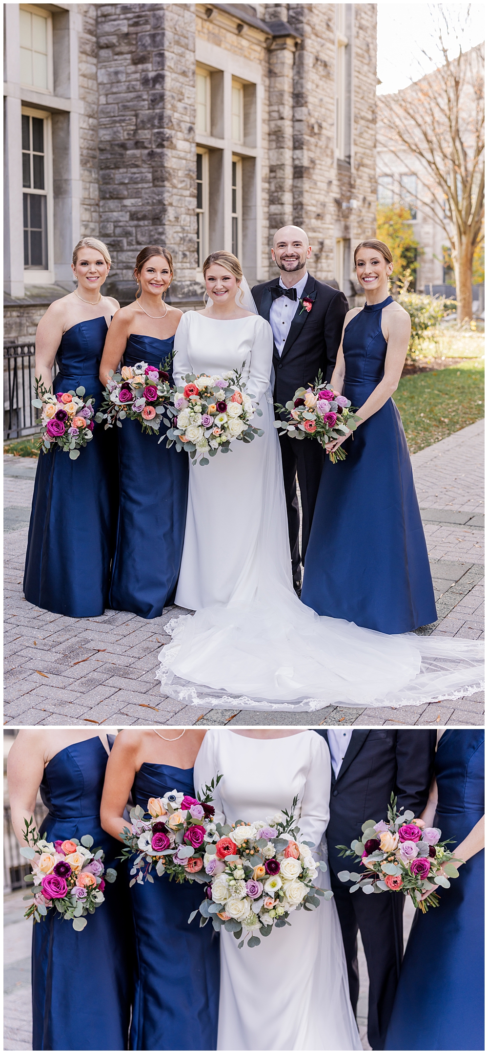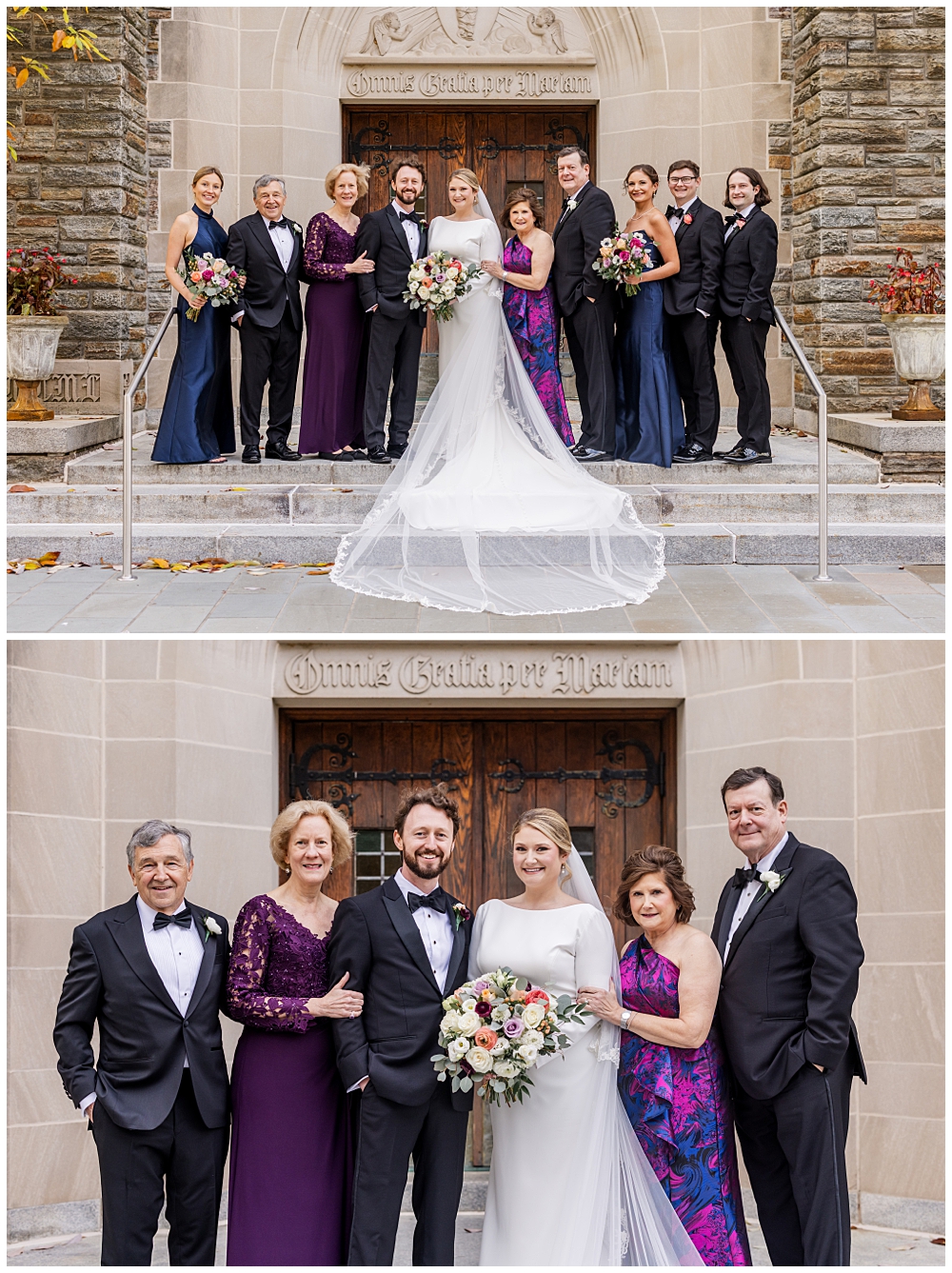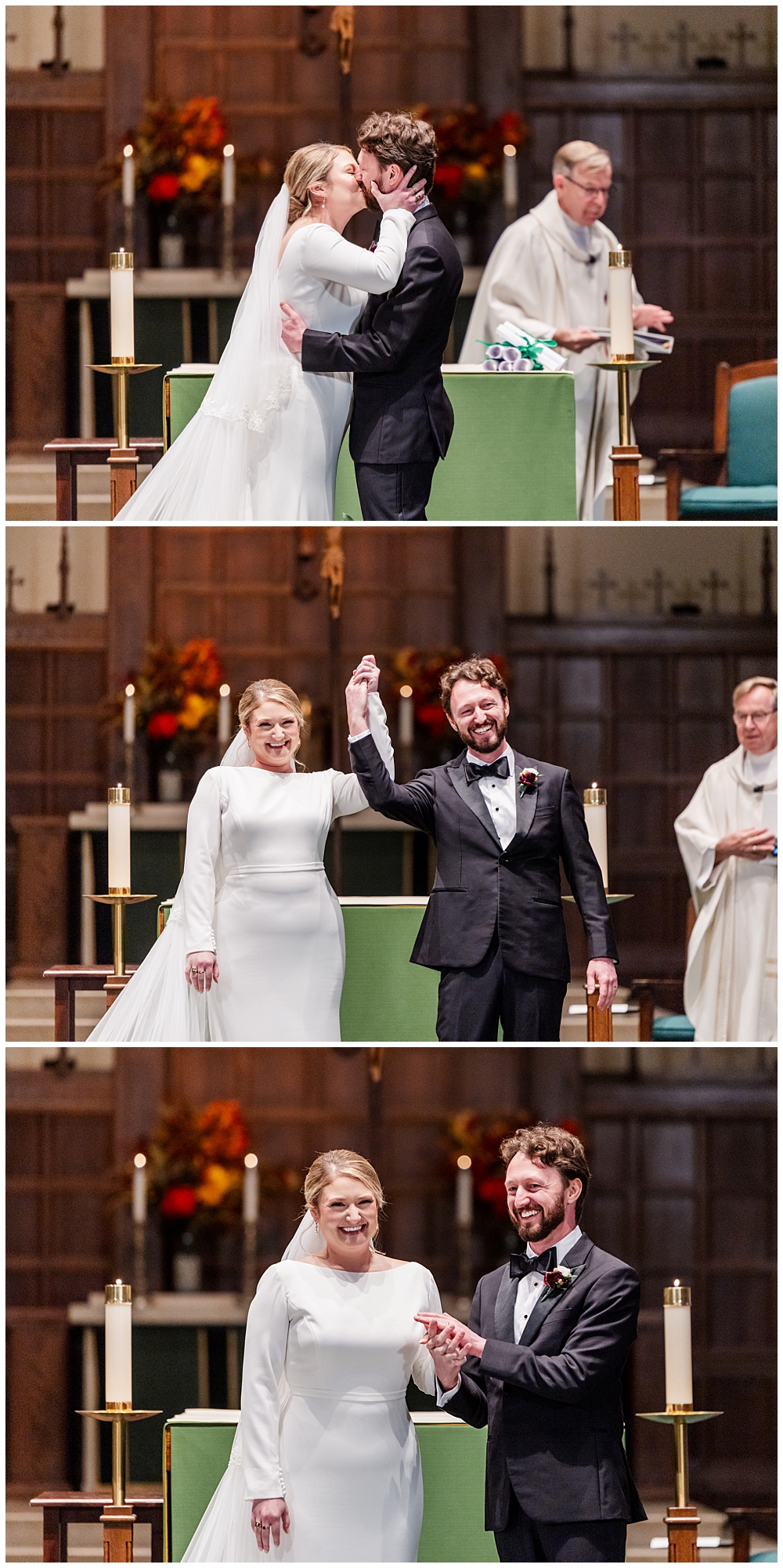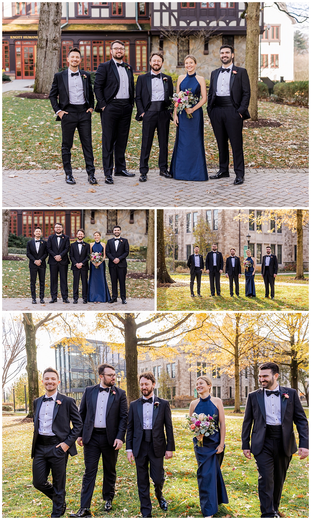 Prior to the ceremony, we explored the grounds for portraits that captured the crisp fall air and the understated beauty of the season. A first look on the lawns outside the chapel, portraits near their favorite hangout spots on campus, soft golden leaves, stone architecture, and quiet pathways created the perfect backdrop for portraits that felt natural, romantic, and unforced.