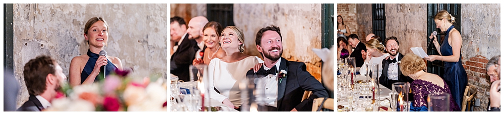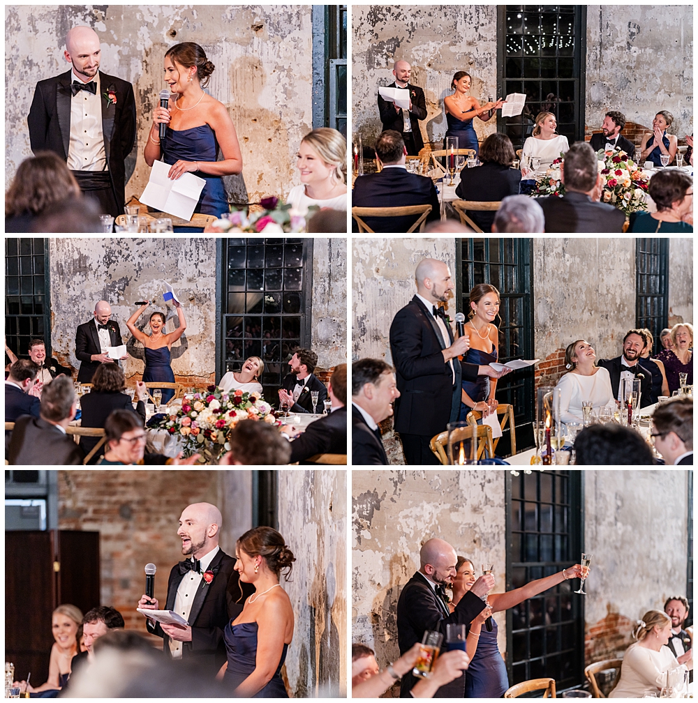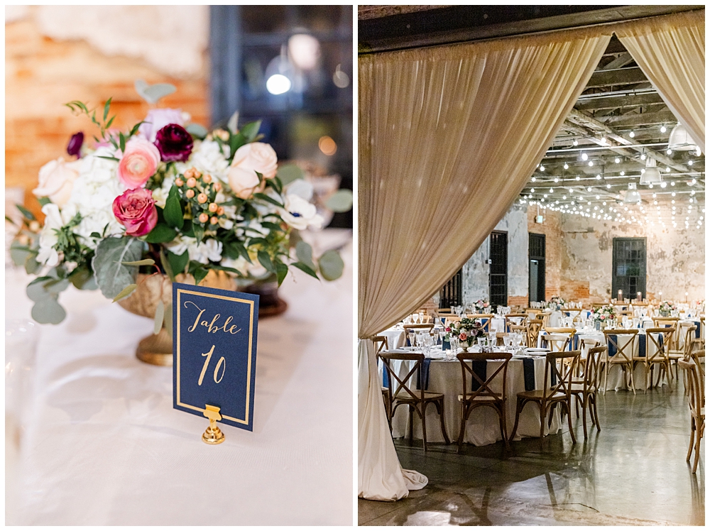 The design struck a beautiful balance—classic florals paired with the industrial character of the venue. Long farmhouse tables, soft candlelight, and thoughtful details made the room feel welcoming and intimate, even as the celebration grew louder and livelier throughout the night.