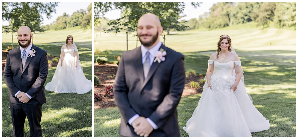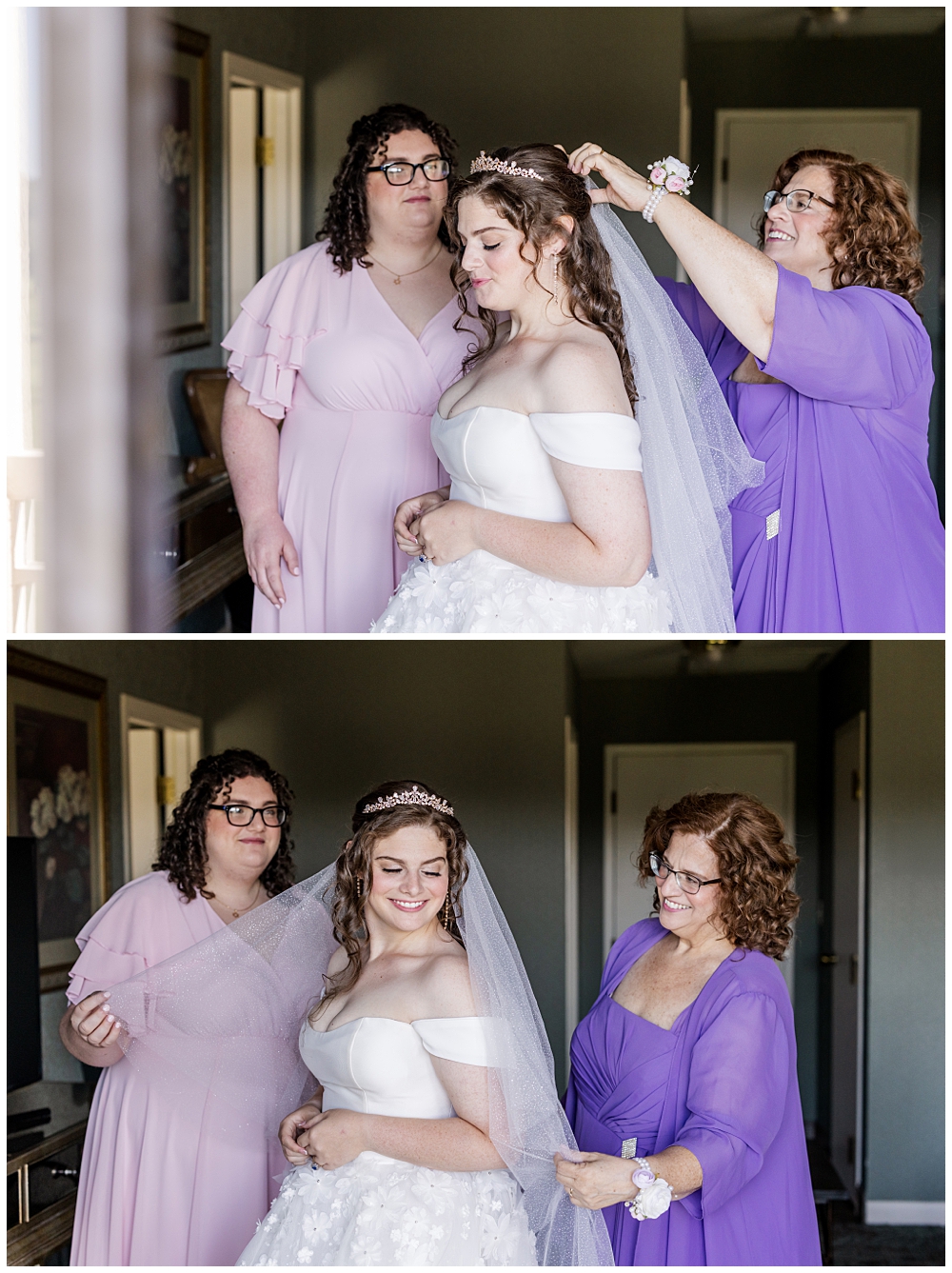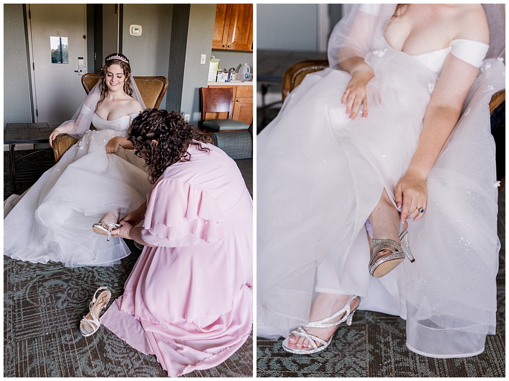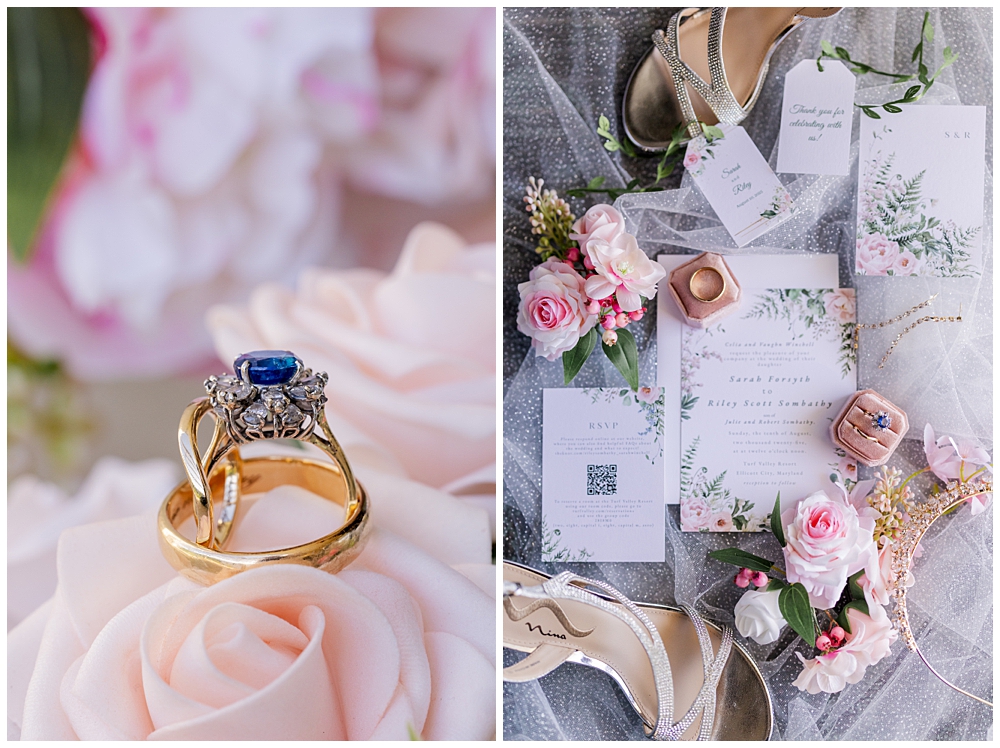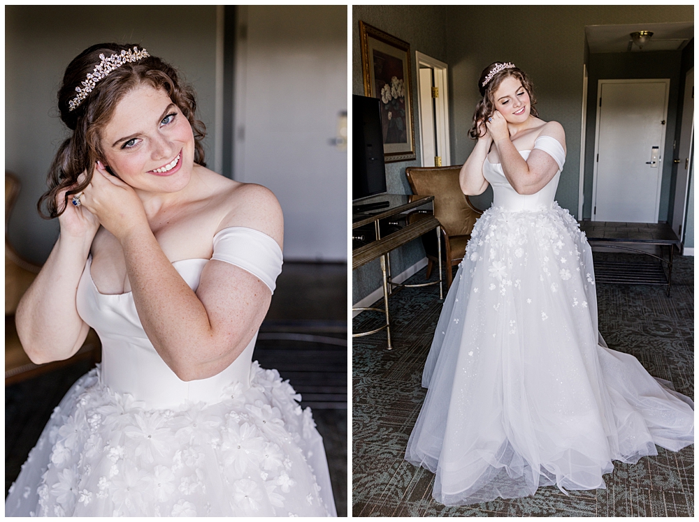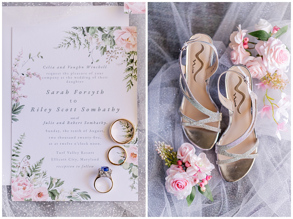 Sarah and Riley both got ready on-site at Turf Valley, which made the whole morning smooth and relaxed. Sarah looked absolutely radiant in her off-the-shoulder gown adorned with delicate floral appliqués and a sparkling tiara. She got ready surrounded by her closest friends and family, and one of the sweetest moments of the morning was her time with her mom and grandparents before heading to see Riley.