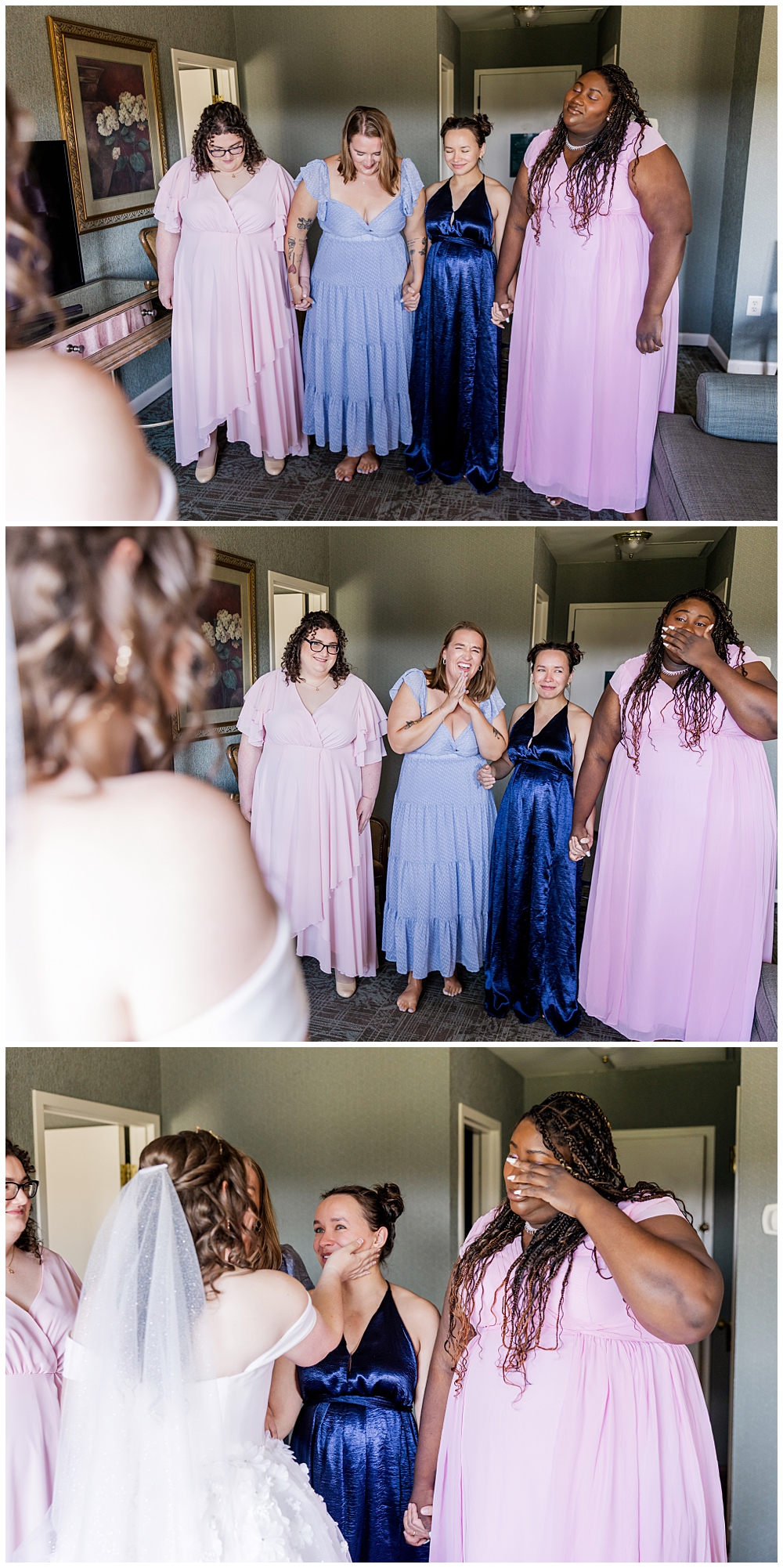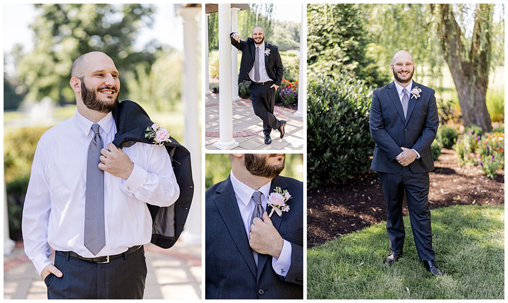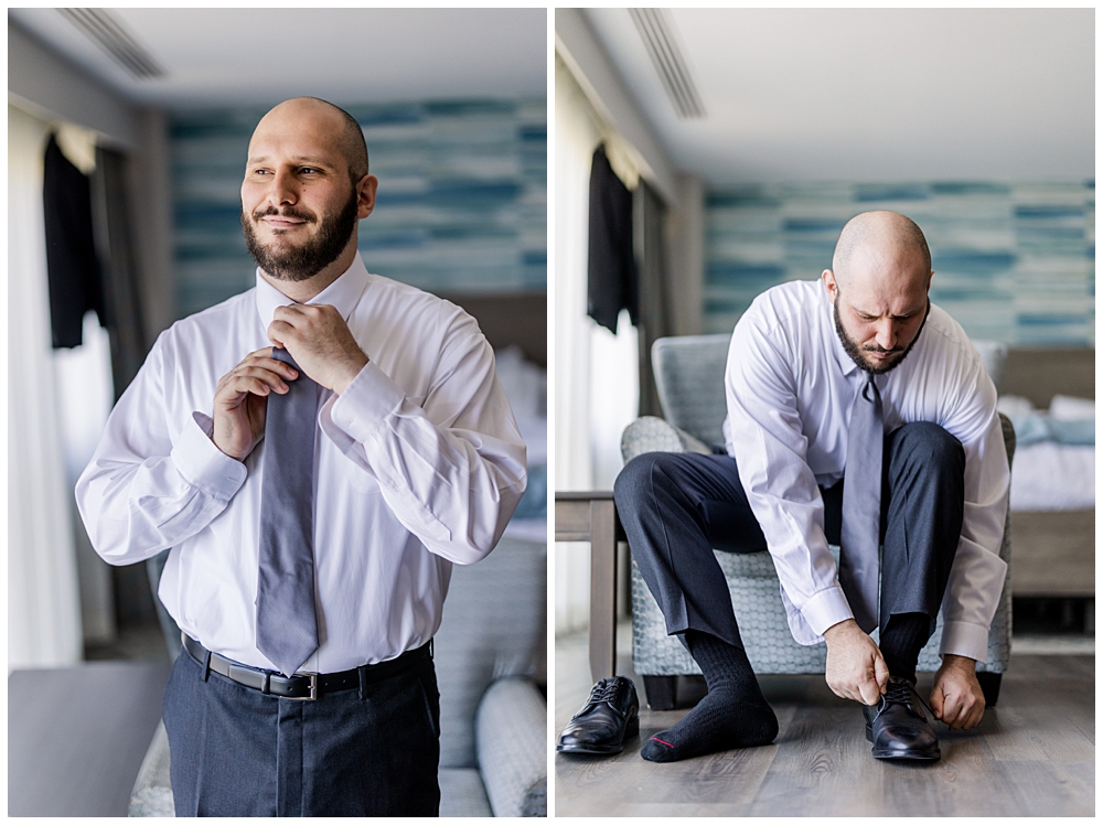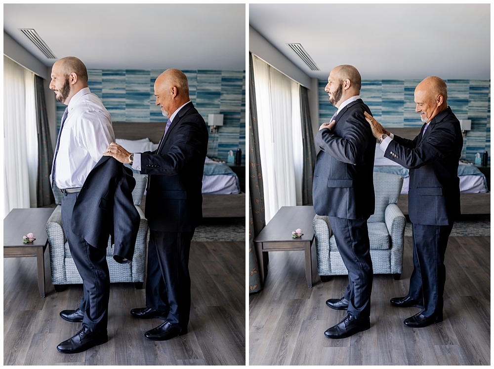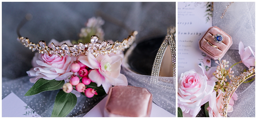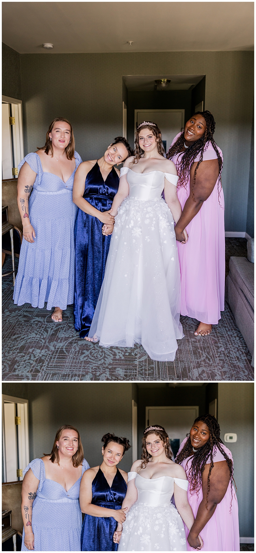 Sarah and Riley both got ready on-site at Turf Valley, which made the whole morning smooth and relaxed. Sarah looked absolutely radiant in her off-the-shoulder gown adorned with delicate floral appliqués and a sparkling tiara. She got ready surrounded by her closest friends and family, and one of the sweetest moments of the morning was her time with her mom and grandparents before heading to see Riley.
