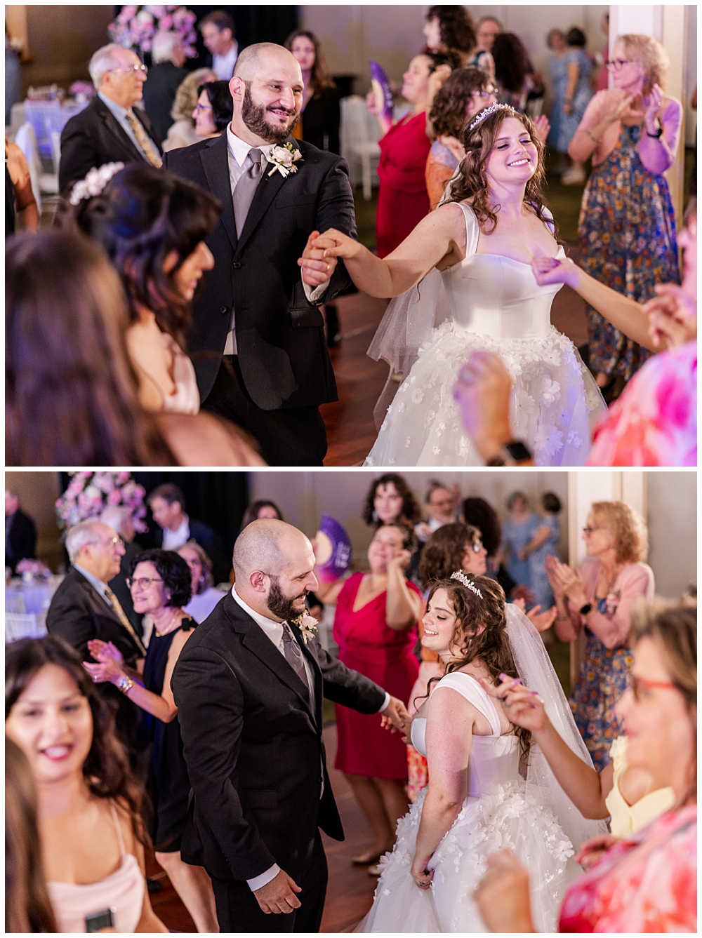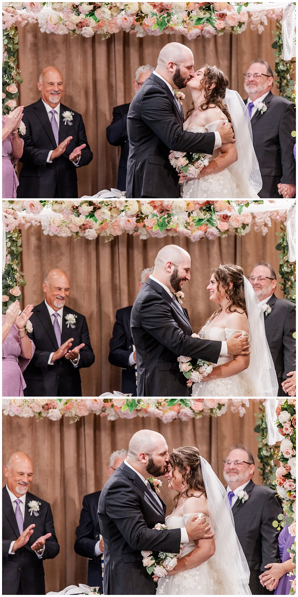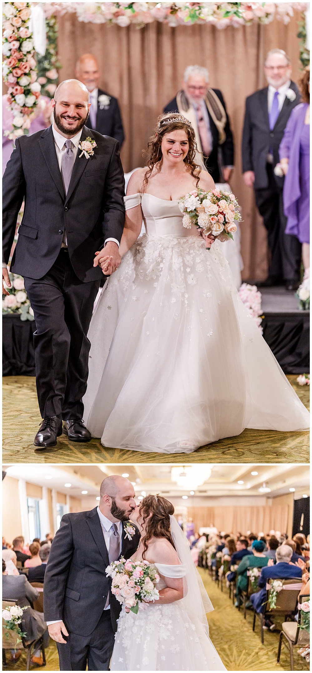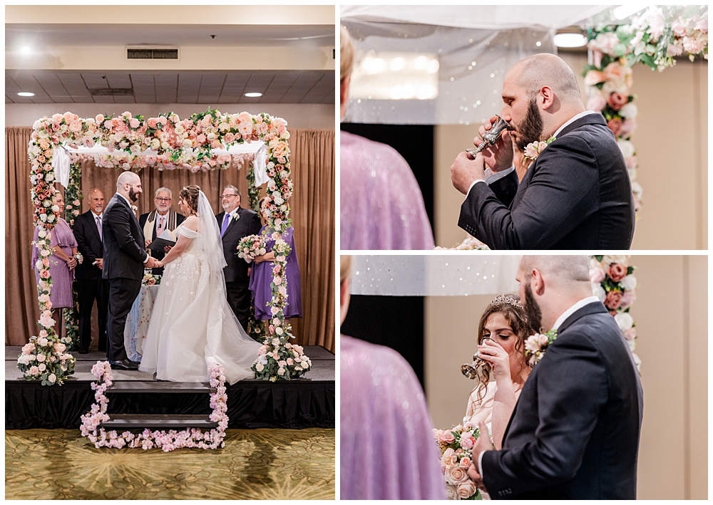 Their indoor Jewish ceremony was stunning — complete with a handmade chuppah crafted by Sarah’s mom and her friends. The floral details perfectly complemented the blush and ivory palette that carried through the day. With over 150 guests watching, the couple exchanged vows, shared laughter, and sealed their marriage with a kiss under the chuppah.
