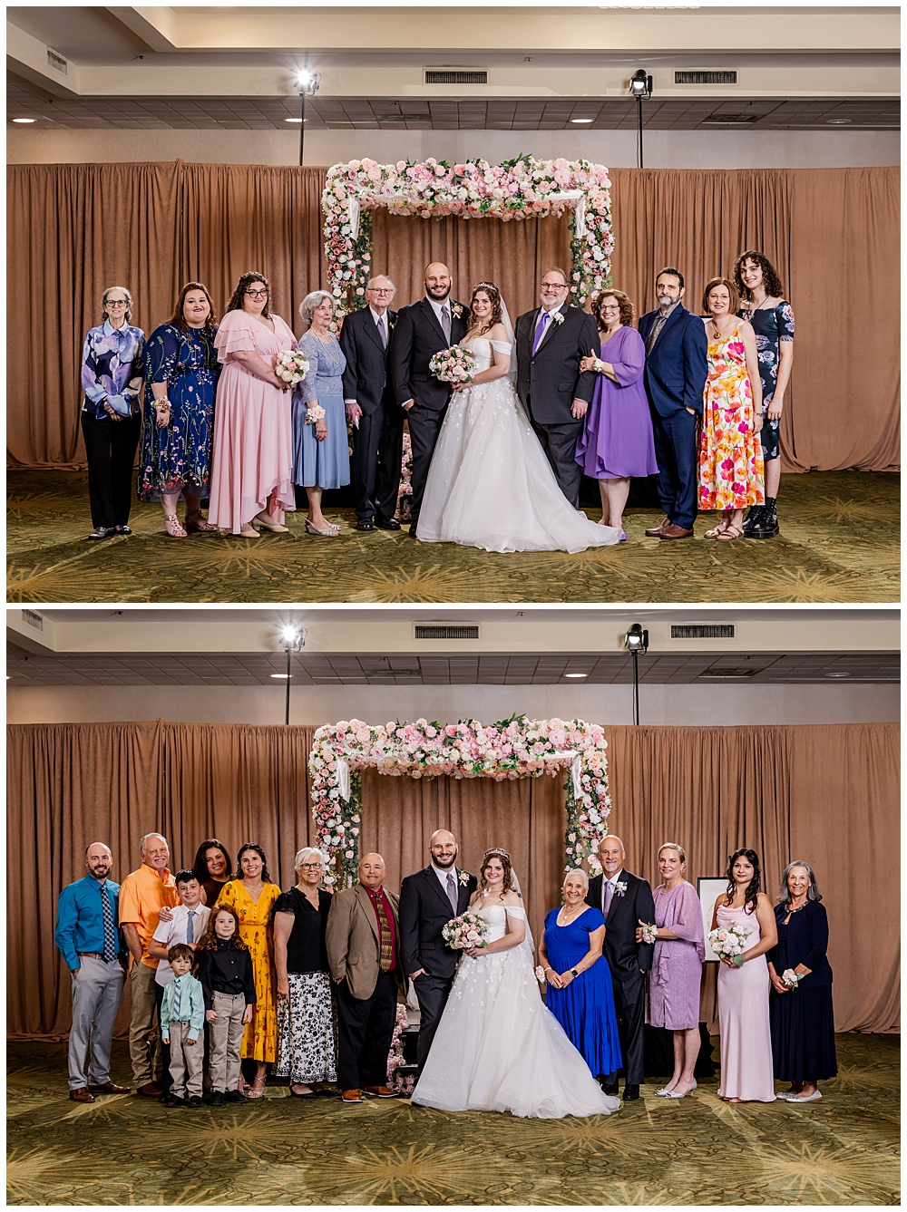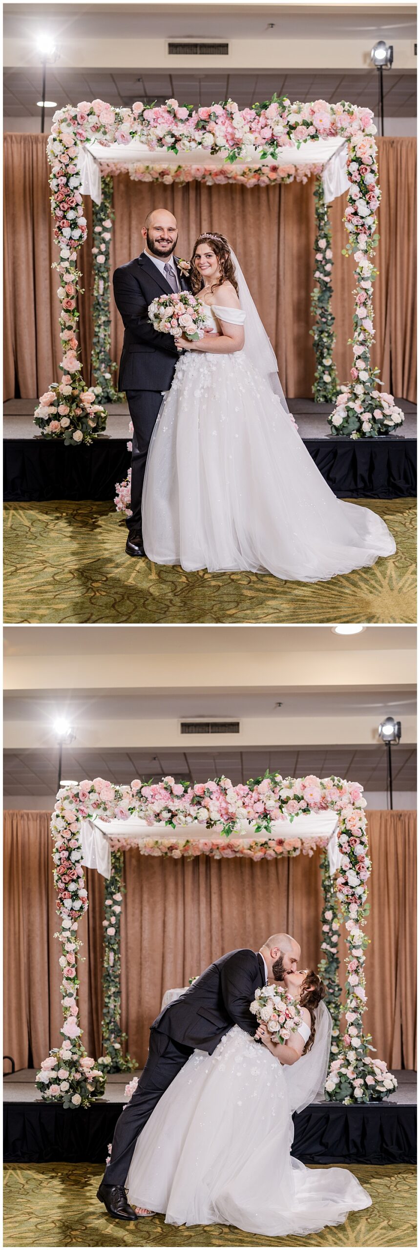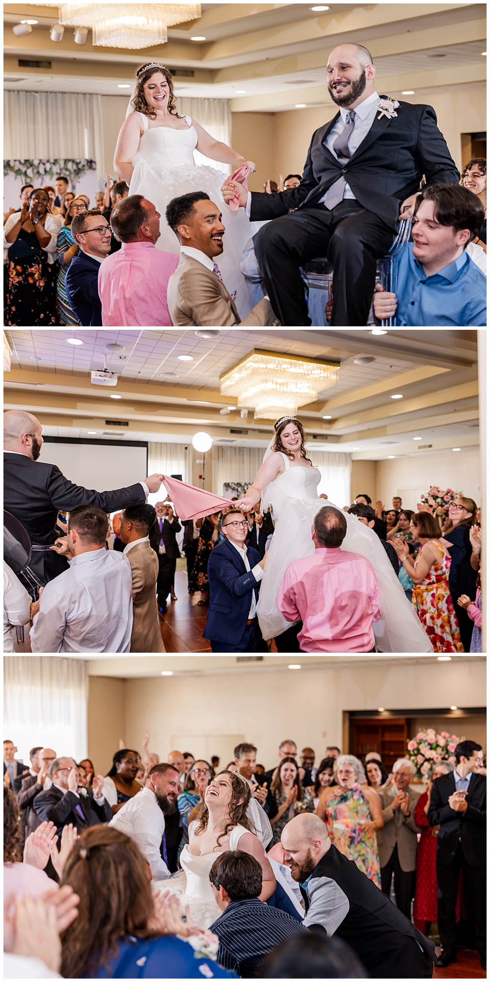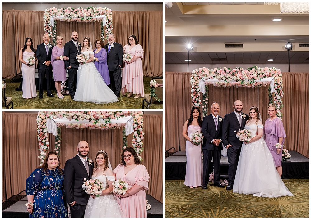 Their indoor Jewish ceremony was stunning — complete with a handmade chuppah crafted by Sarah’s mom and her friends. The floral details perfectly complemented the blush and ivory palette that carried through the day. With over 150 guests watching, the couple exchanged vows, shared laughter, and sealed their marriage with a kiss under the chuppah.