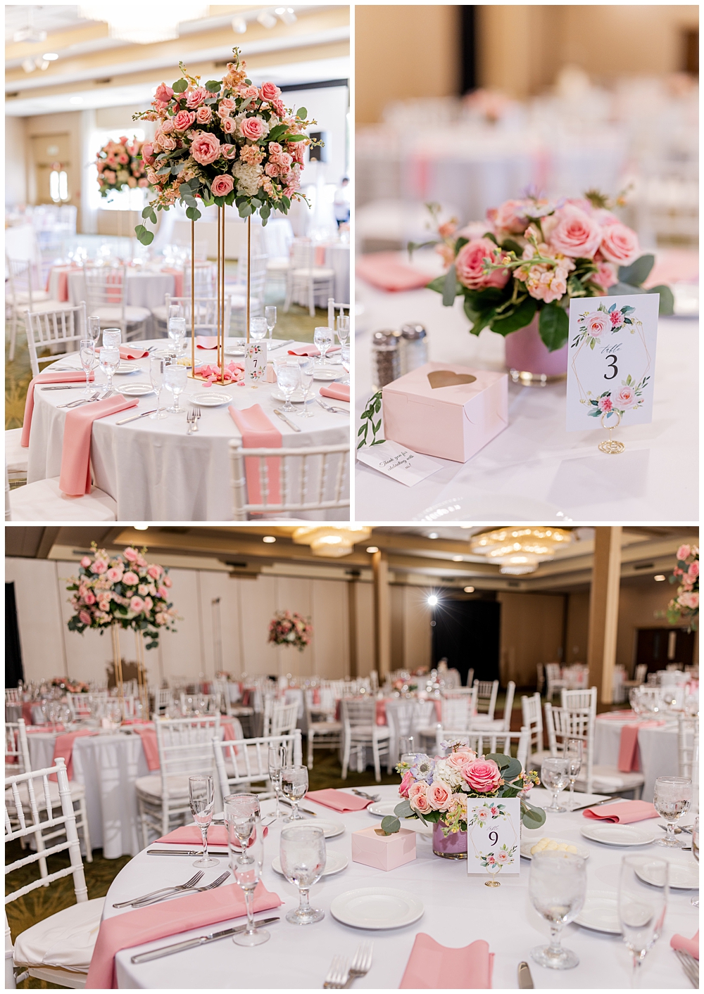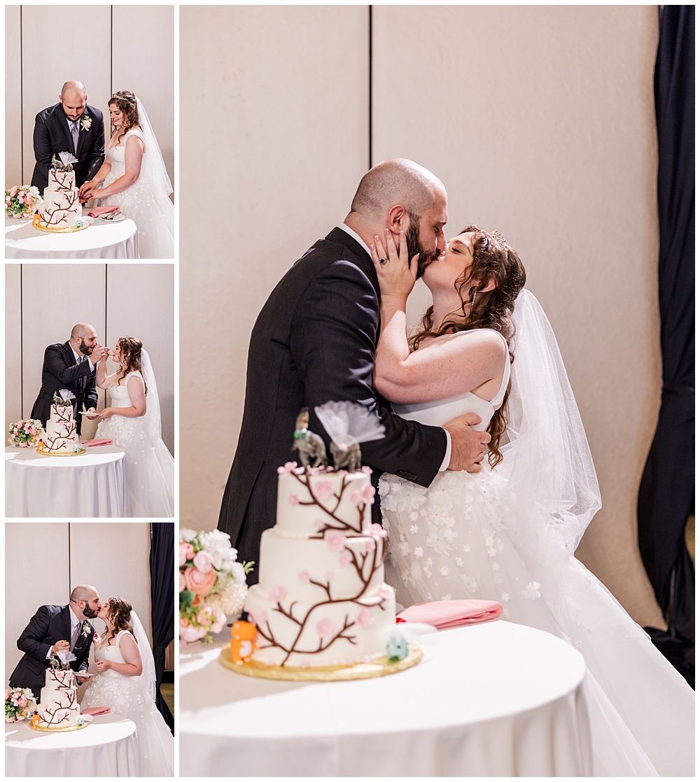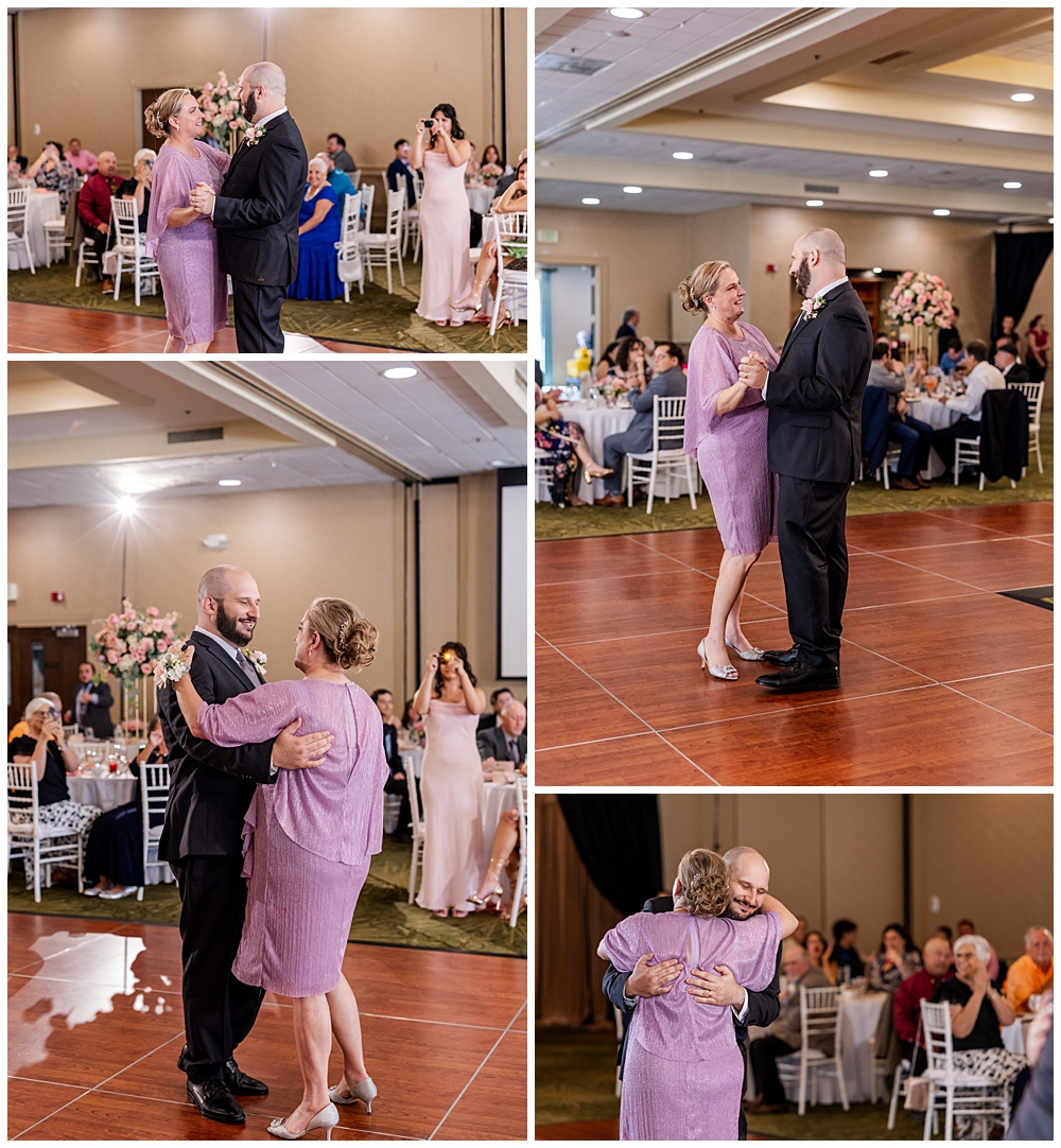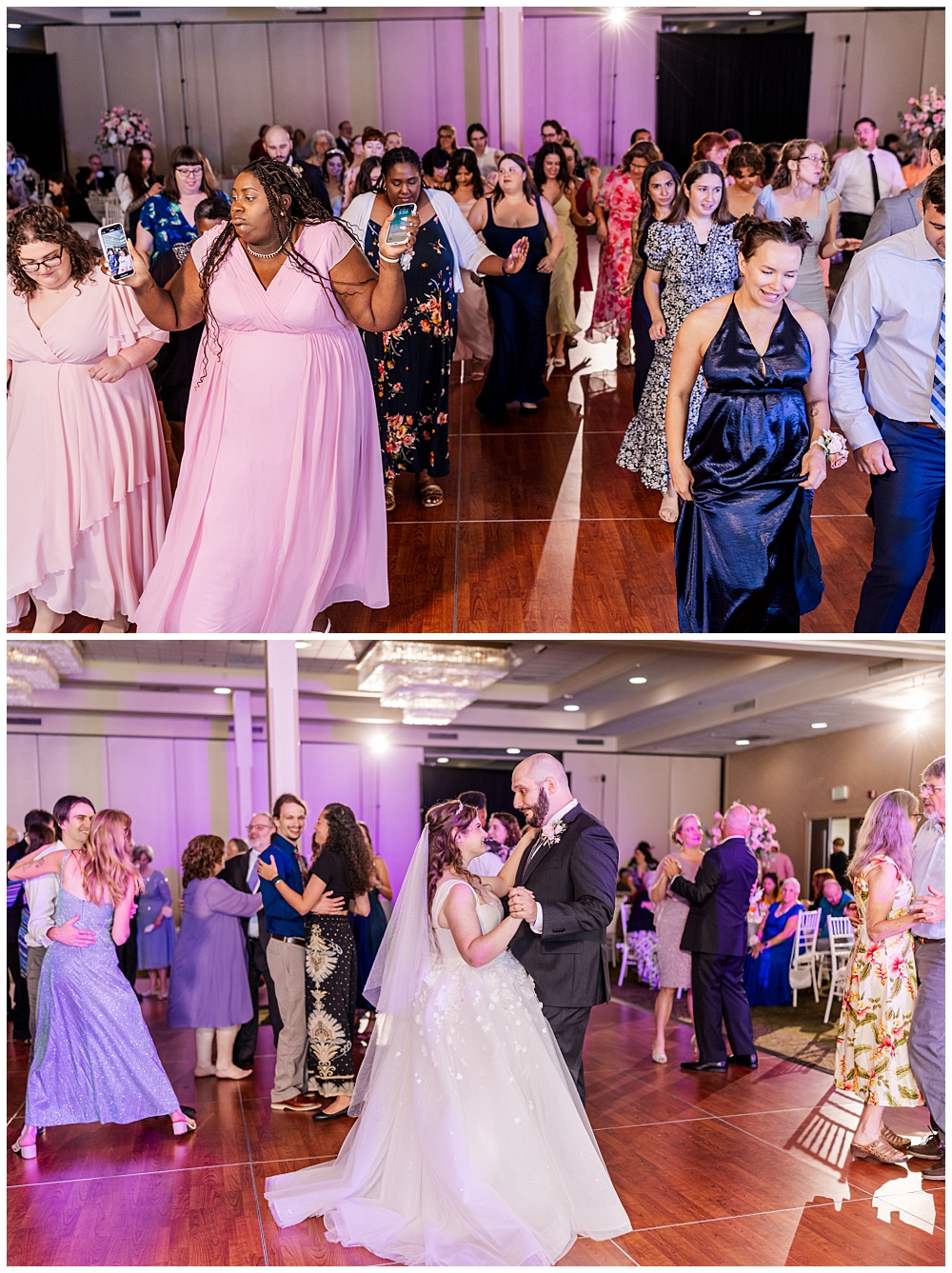 The ballroom at Turf Valley was transformed with elegant white and blush décor, tall floral centerpieces, and glowing candlelight. Their guests enjoyed an incredible variety of food (there was so much food — something for everyone!) and a lively, joy-filled celebration that kept the dance floor packed from start to finish.